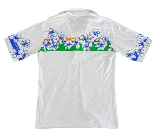 Vintage 1970s Hawaii Floral White Single Stitch Polo Shirt Medium