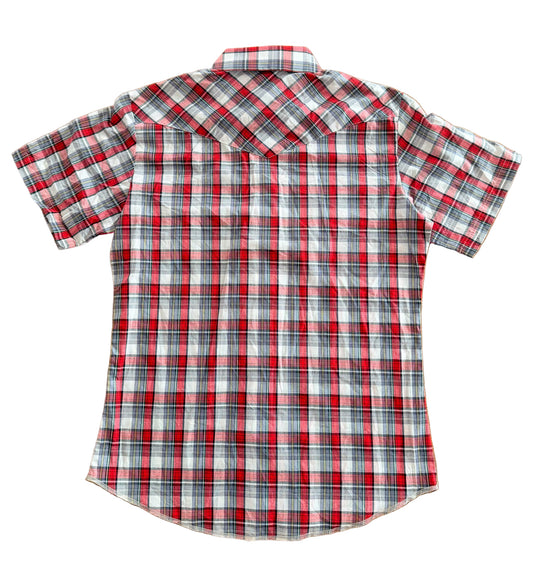 Vintage Wrangler Western Plaid Snap Red Grey Short Sleeve Cowboy Button-Up Shirt, Size-Medium