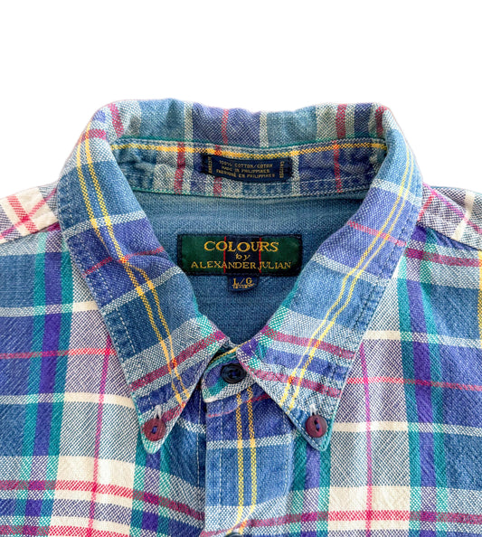 Vintage 90s Colours by Alexander Julian Plaid Short Sleeve Button-Up Shirt – Blue Multicolour Check, Size-Large