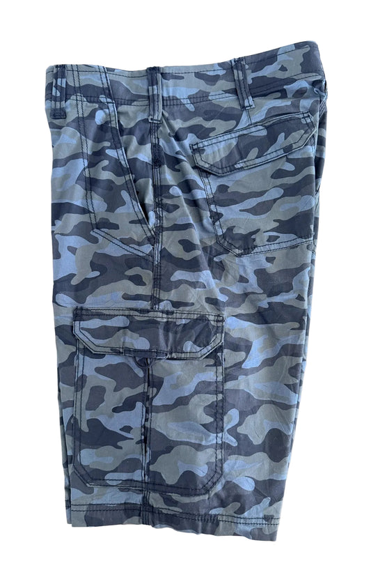 Vintage Lee Camo Cargo Pocket Blue Grey Woodland Camouflage Utility Jort Shorts, Large 34"Waist