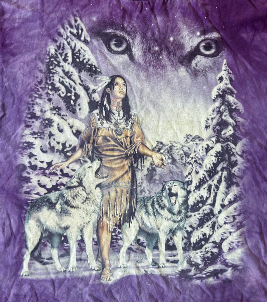 Vintage 1990s Indigenous Wildlife Wolves Print Purple Cotton T-shirt 2XL