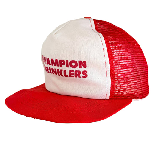Vintage 80s Champion Sprinklers Red White Mesh Snapback Cap USA Promo Workwear Trucker Cap
