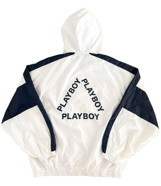 Playboy Triangle Logo Branded Windbreaker Jacket – White Hooded Zip-Up 2000s Vintage Y2K Streetwear Lightweight Nylon Shell,Size-XL