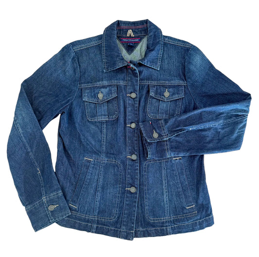 Vintage Tommy Hilfiger Dark Wash Denim Button Up Utility Pockets 90s Y2K Womens Jacket, Size-Large