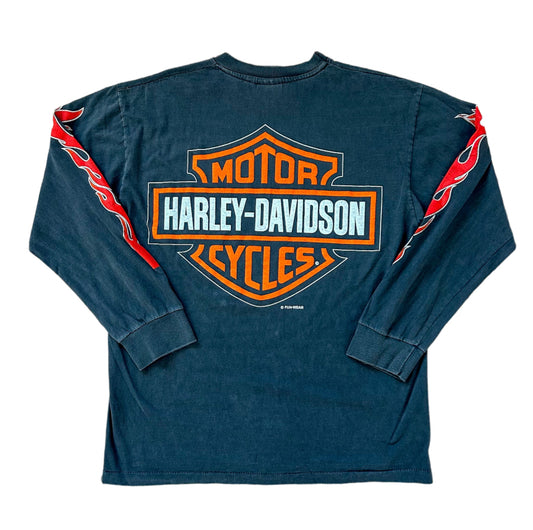 Vintage 90s Harley-Davidson Flame Sleeve Long Sleeve Tee | Biker Graphic Shirt USA Made, Single Stitch, Size - Large