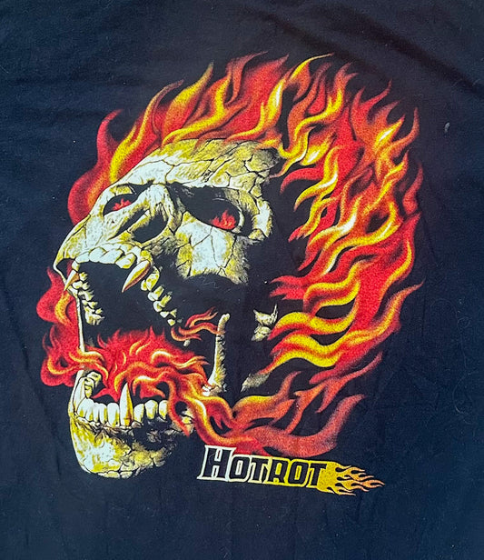 Vintage Skull and Flame Print Hot Rod Black Cotton T-shirt XL