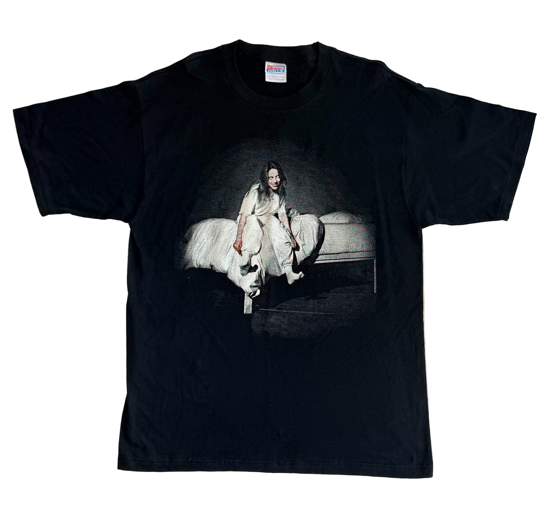 This Billie Eilish graphic band tee features the hauntingly iconic artwork from her debut album “When We All Fall Asleep, Where Do We Go?”. Printed on a classic black heavyweight tee, the design captures Billie’s signature dark-pop aesthetic — sitting on a white bed in her eerie dreamlike world — making it instantly recognisable to fans and collectors.