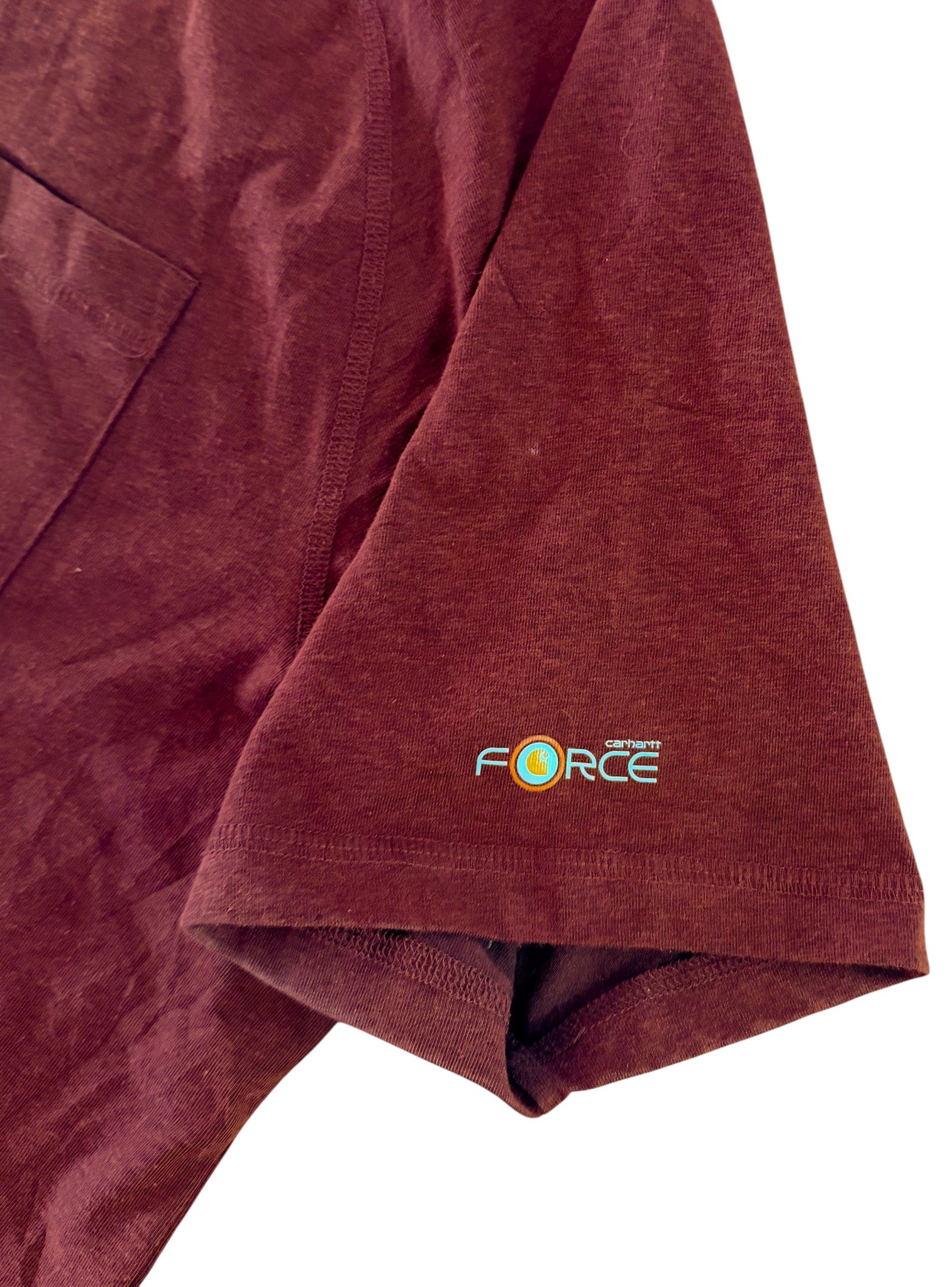 A classic Carhartt pocket t-shirt in a rich burgundy colour featuring the iconic Carhartt logo patch on the chest pocket and Carhartt Force branding on the sleeve.