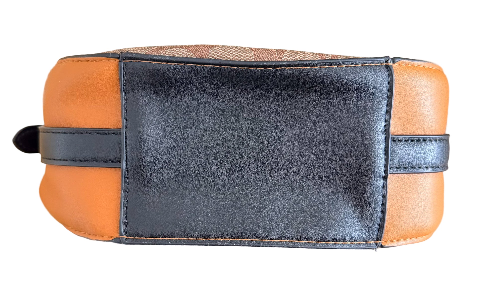 This Coach Signature Jacquard Demi Shoulder Bag embodies the timeless sophistication and craftsmanship the brand is known for. Featuring the classic Coach “C” monogram canvas in tan and brown, it’s accented with black and caramel leather trim, gold-tone hardware, and a Coach New York carriage logo on the front.