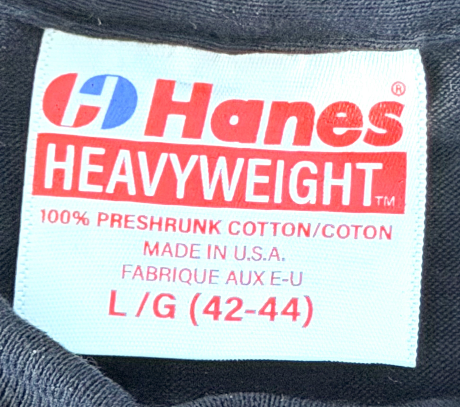 Constructed on a Hanes Heavyweight t-shirt and featuring single stitch sleeves and hem, a manufacturing detail commonly found on many earlier t-shirts.