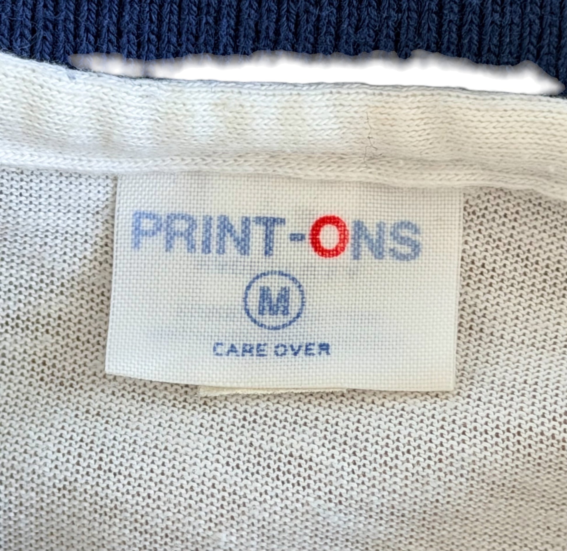 Finished with a contrast navy collar and a skier graphic print, this piece captures a retro alpine aesthetic tied to Mammoth Mountain, California. The lightweight cotton construction and Made in USA manufacturing are consistent with early–mid 1980s production.