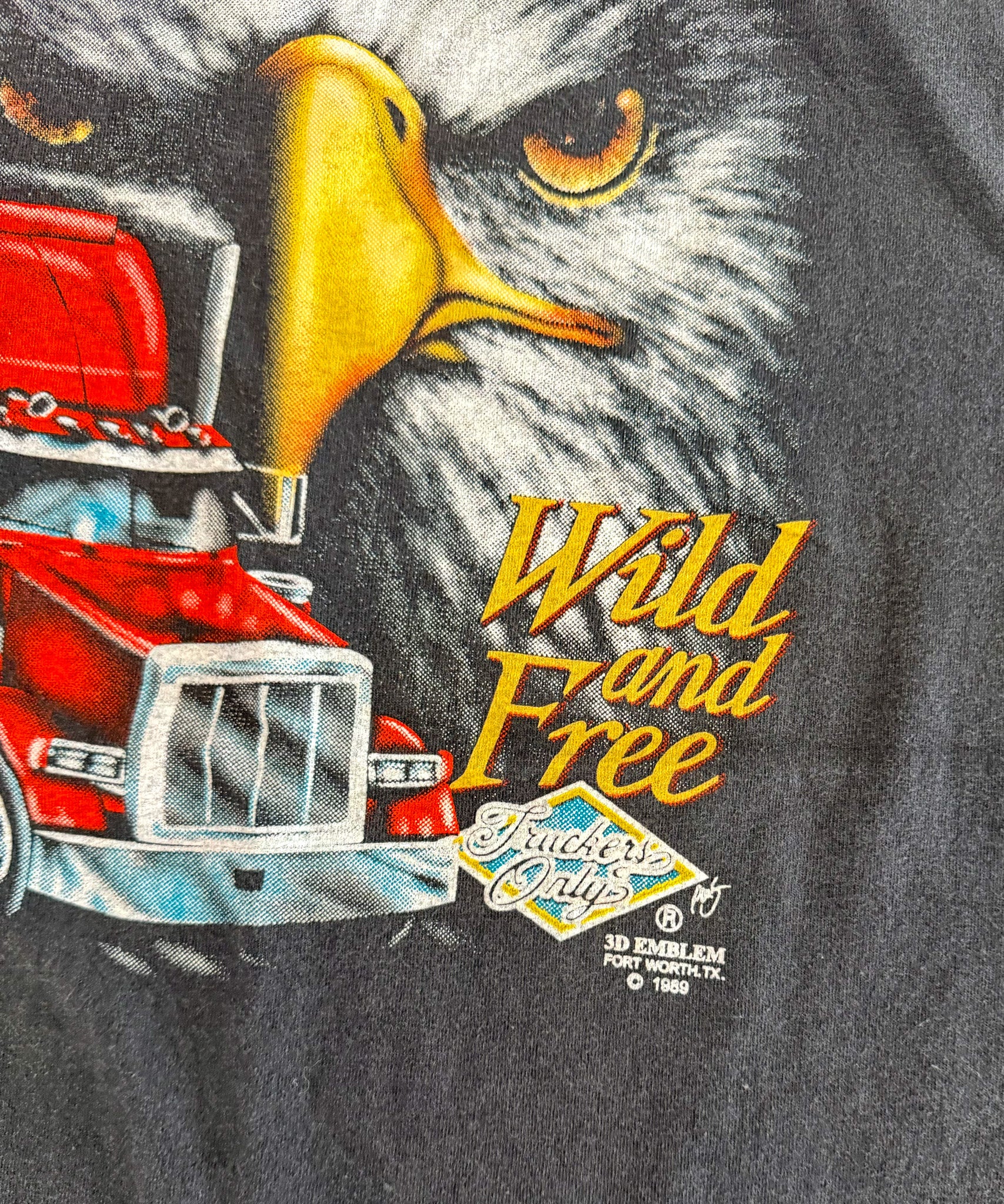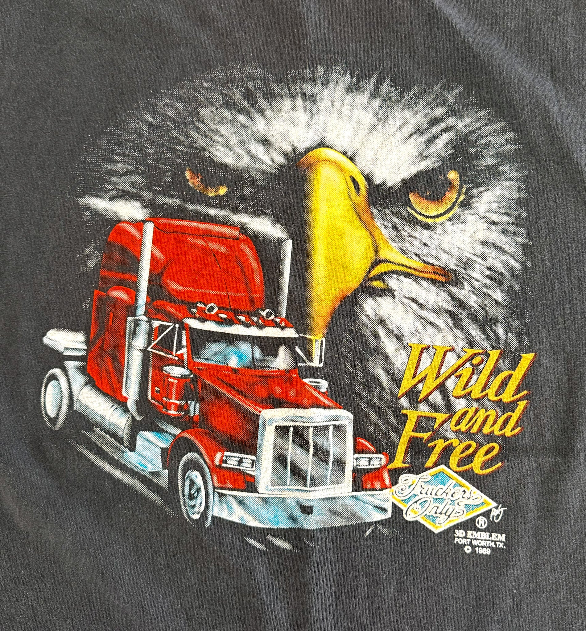 Iconic bald eagle, red semi-truck, and “Wild and Free” print