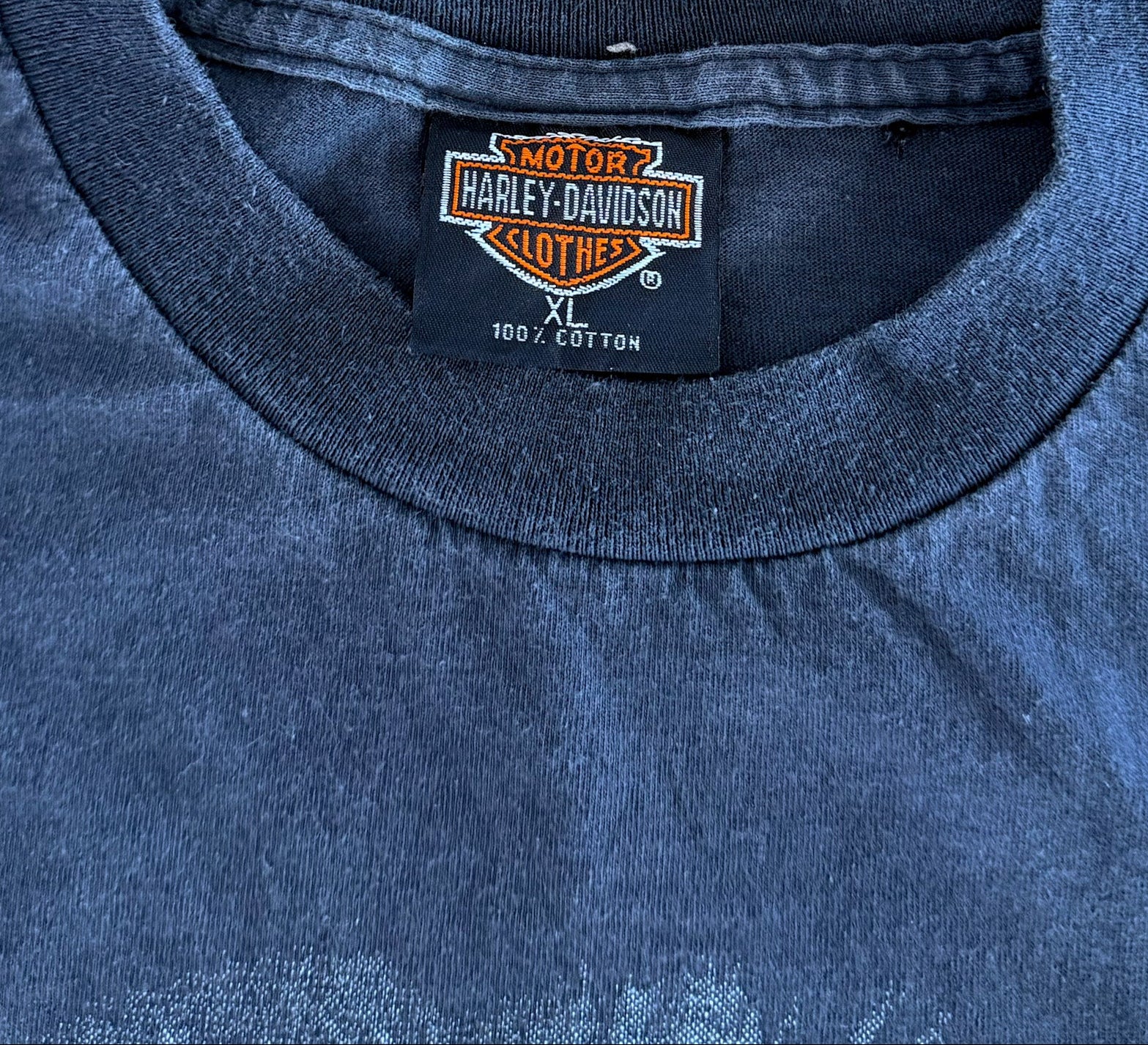 Made from heavyweight 100% cotton with a Harley-Davidson tag, this shirt offers the premium quality and durability that define late-80s American tees. The slightly faded navy base adds authentic vintage character and softness from decades of perfect wear.