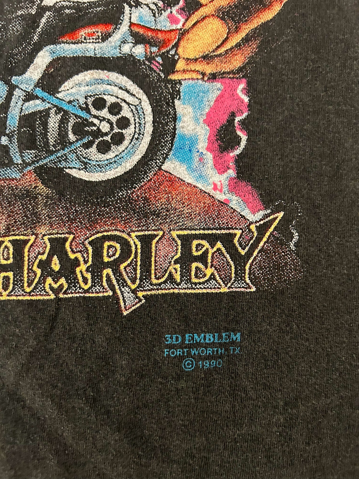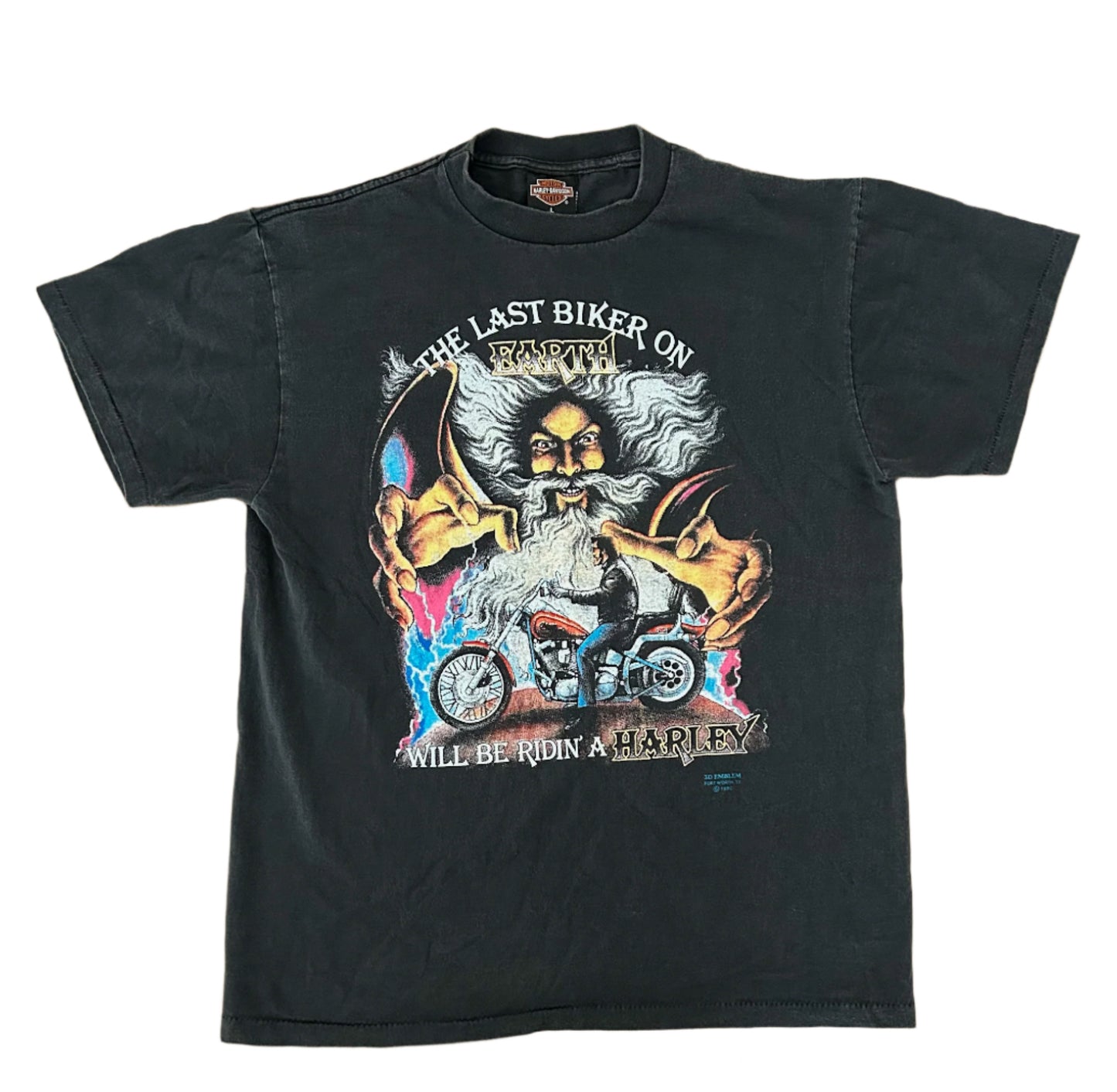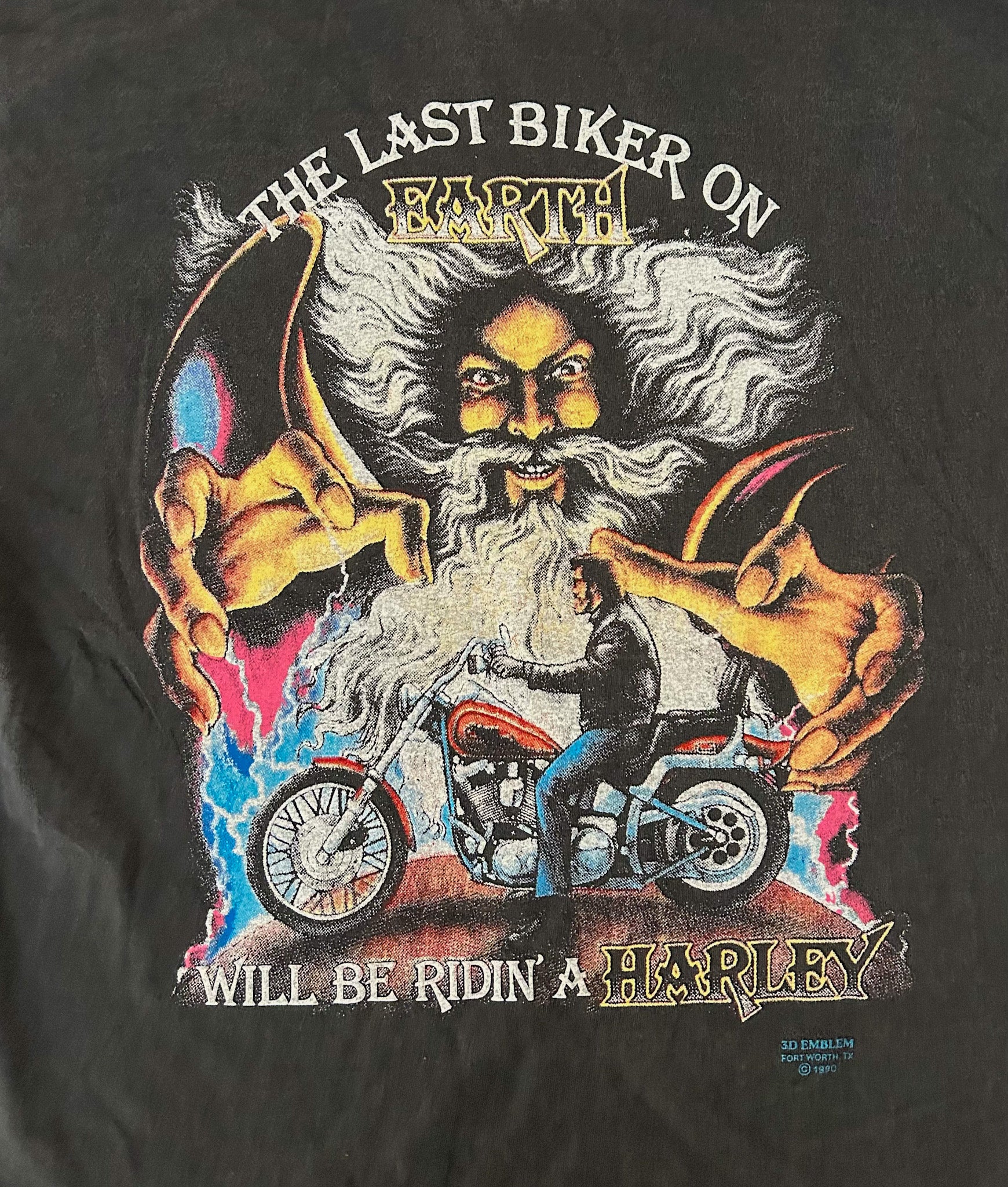 Vintage 1990 Harley Davidson Single Stitch Made USA Double Sided Print Last Biker On Earth Black Cotton T-shirt Large Rare