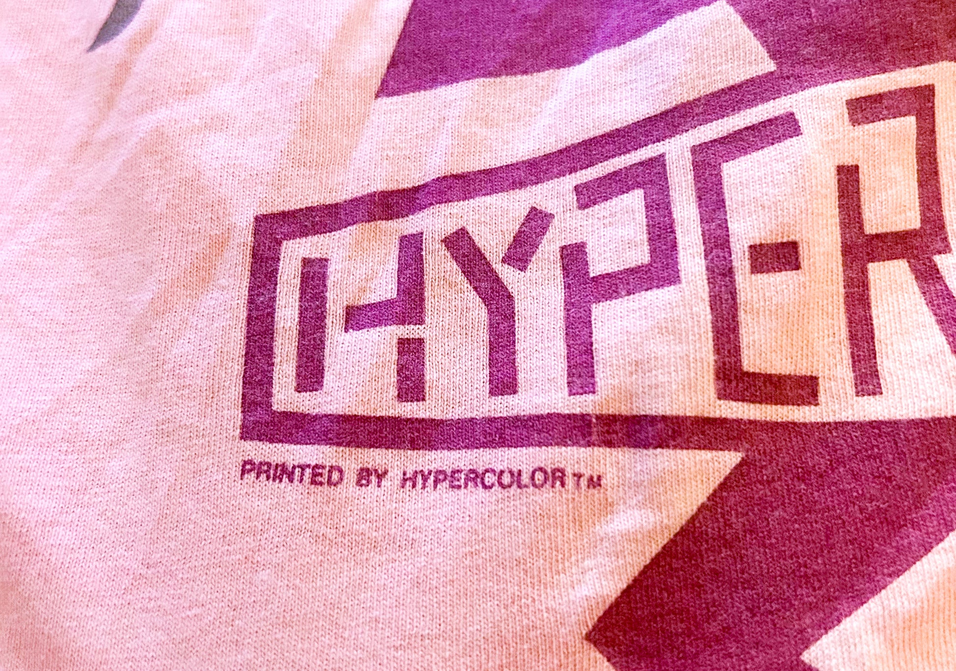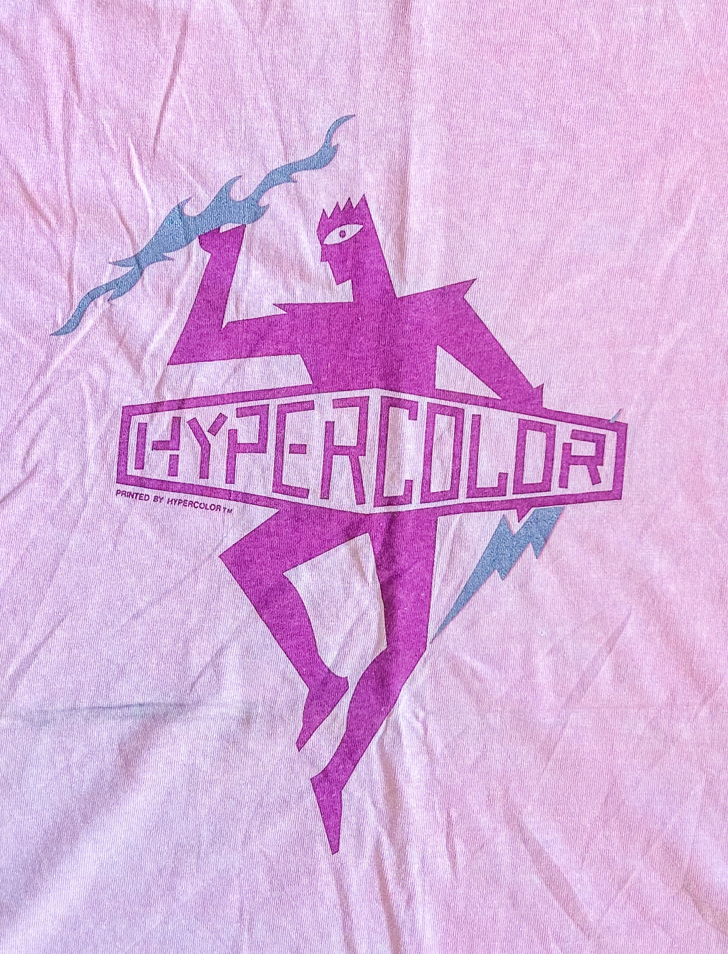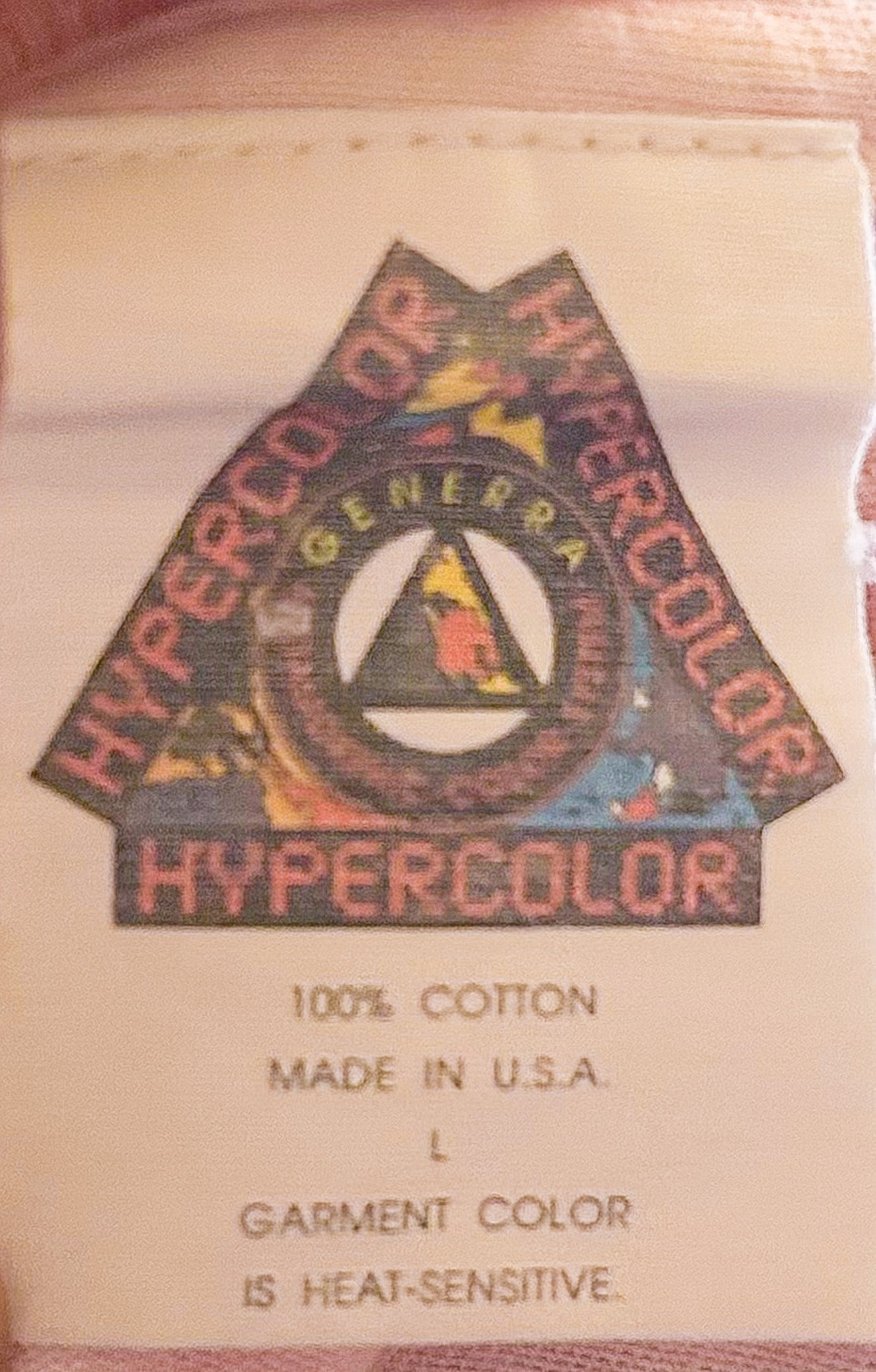 Additional Info: Hypercolour t-shirts were manufactured by Generra Sportswear company of Seattle. They were designed with a thermochromic pigment made by Matsui Shikiso Chemical of Japan, that changed between two colours when either cold or hot!