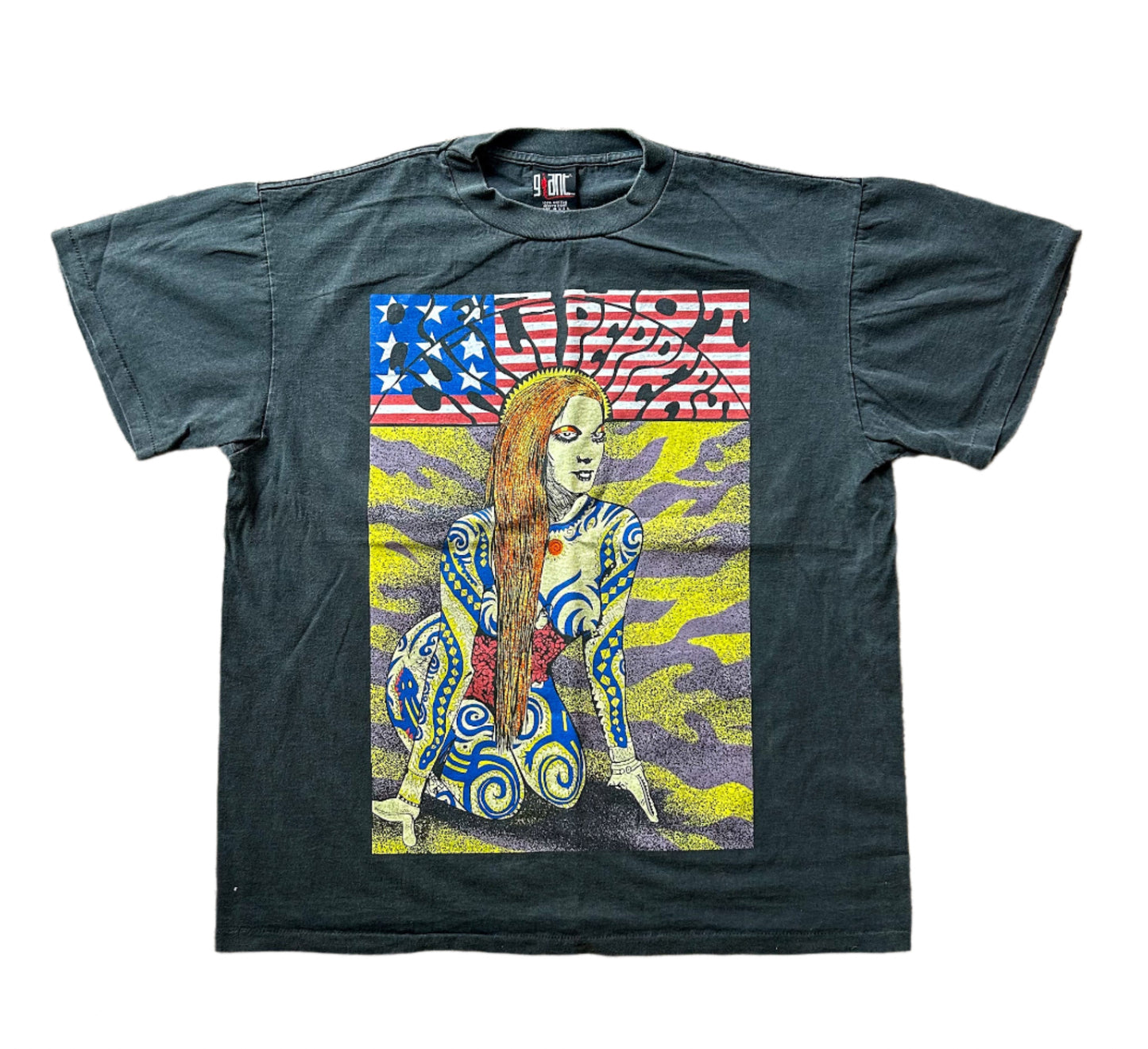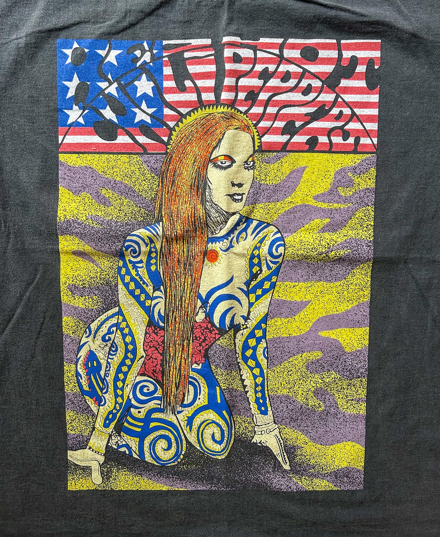 This vintage 1990s Red Hot Chili Peppers Giant Tag band t-shirt is a must-have for lovers of rare rock tees, alternative music history, and collectible vintage streetwear. Featuring bold psychedelic artwork of a tattooed woman with vibrant colors and an American flag backdrop on the front, paired with the iconic RHCP asterisk logo in red on the back, this shirt embodies peak 90s band merch style.