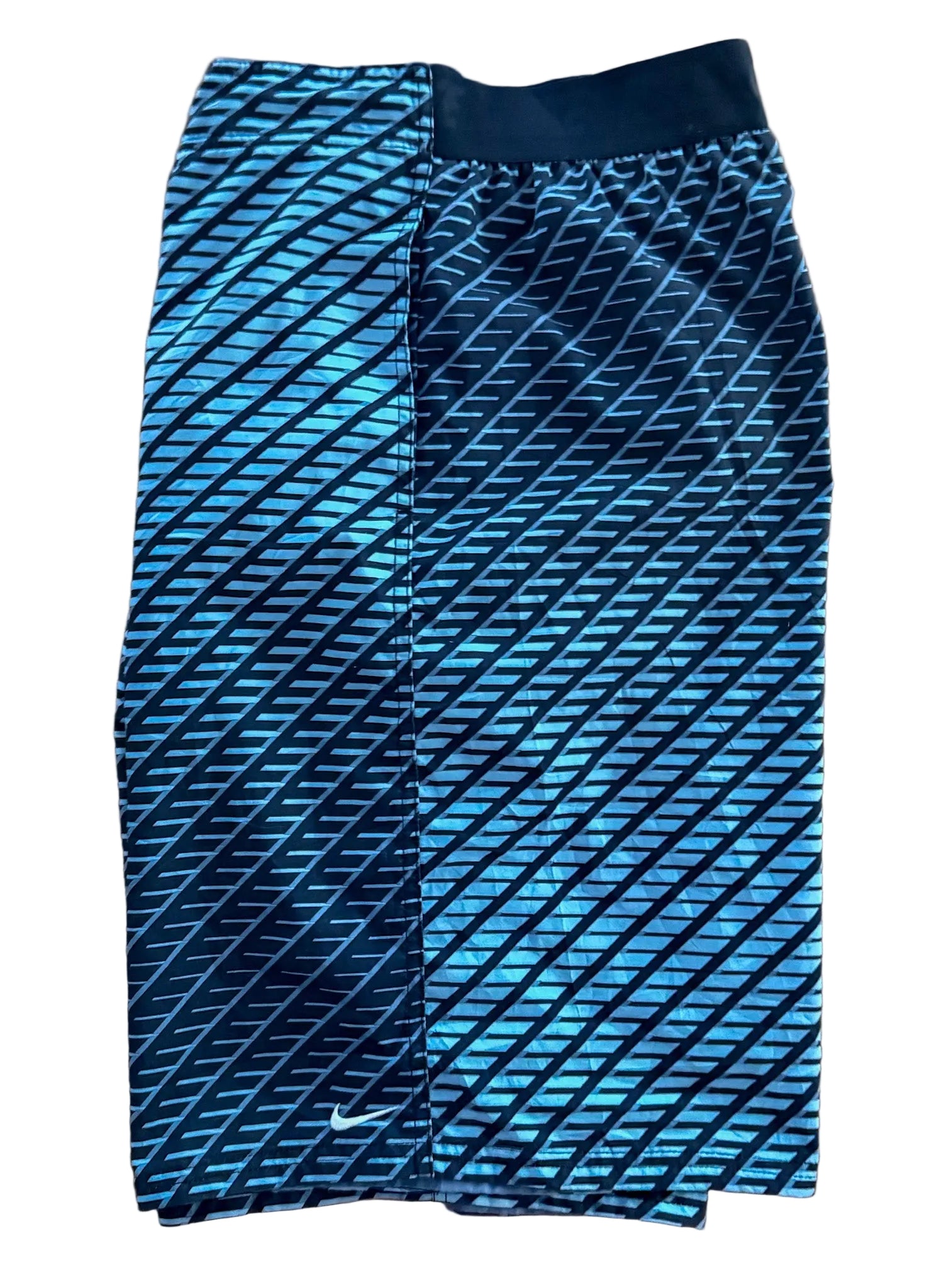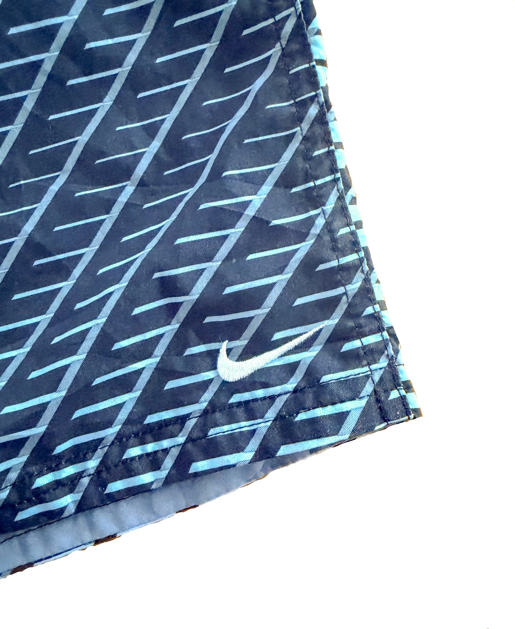 A clean pair of Nike board shorts featuring a striking blue geometric pattern and subtle embroidered Nike Swoosh near the hem.