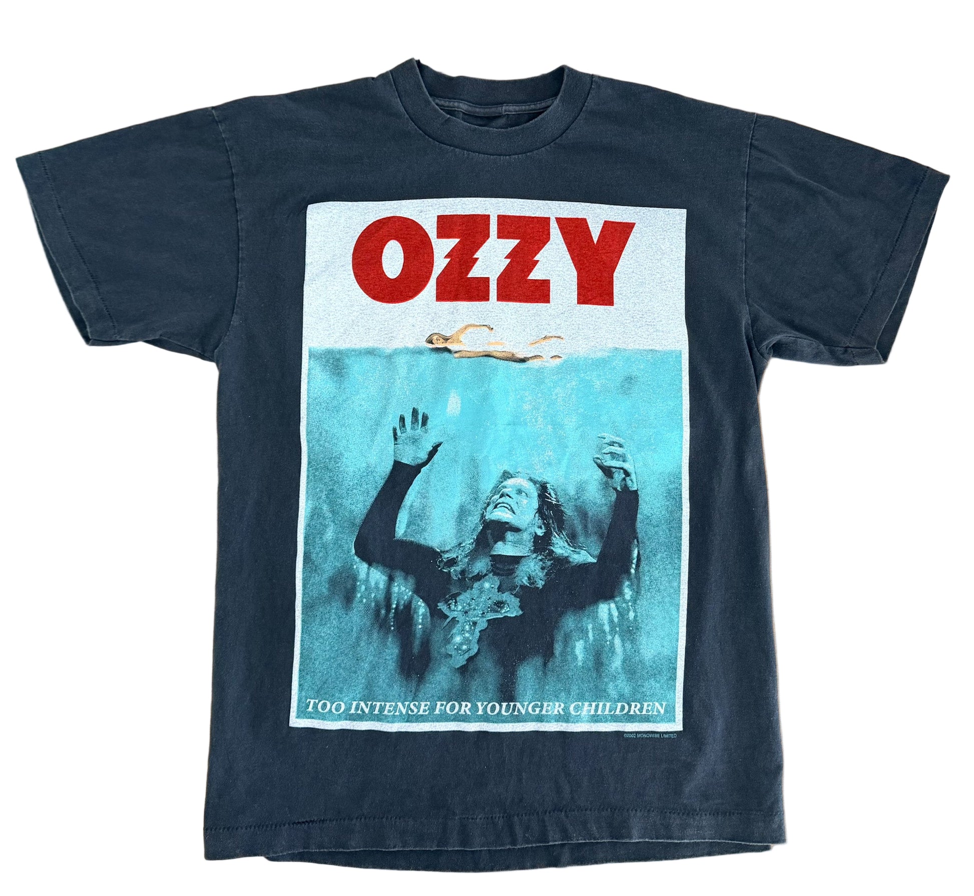 This vintage 2002 Ozzy Ozzfest tour T-shirt is an essential piece for fans of heavy metal, early-2000s rock culture, and collectible band merch. Printed on a deep black heavyweight cotton tee, it features a striking front graphic with bold red “OZZY” lettering above dramatic aqua-toned artwork and the slogan “Too Intense for Younger Children.”