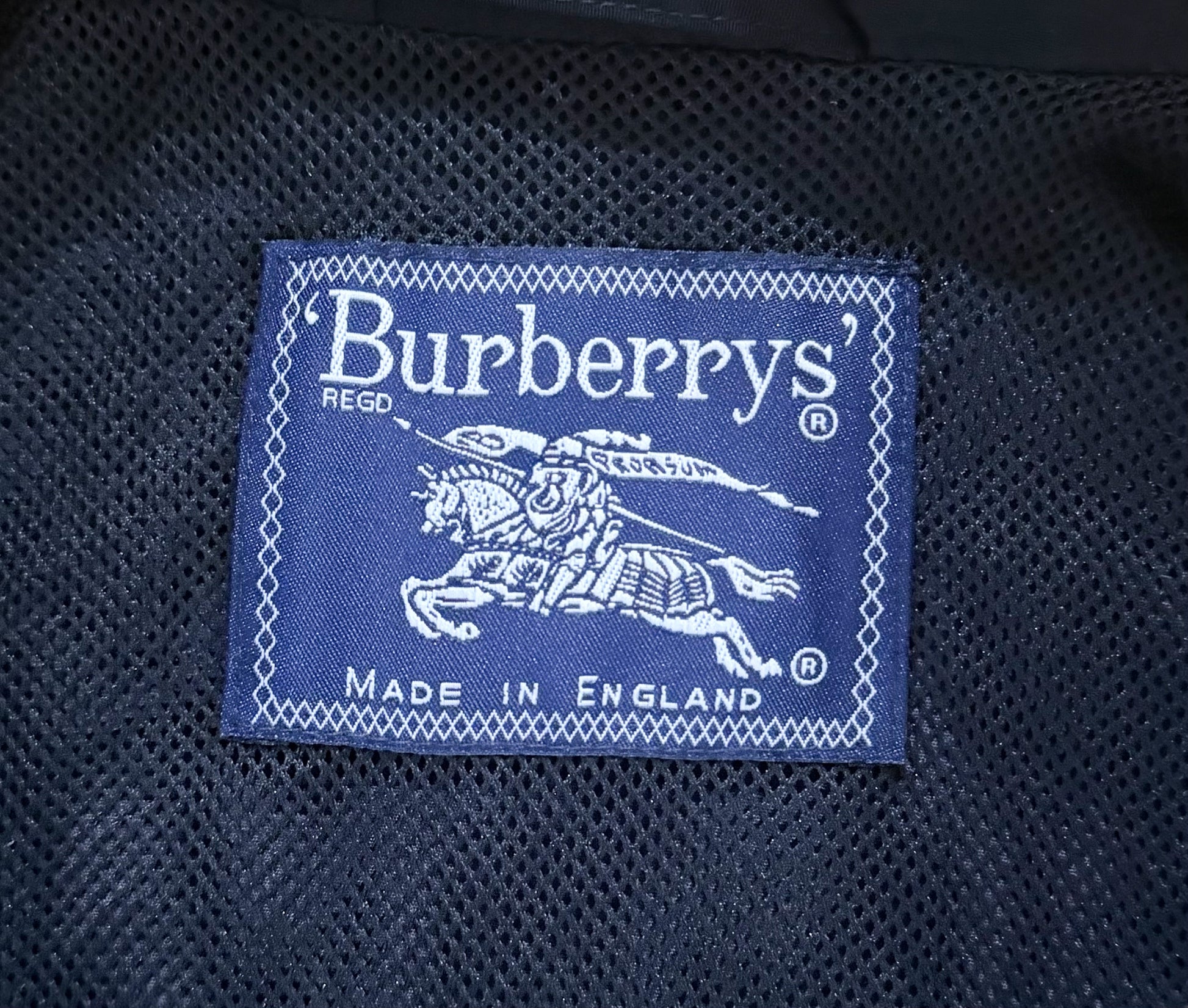 The presence of the Burberrys’ label (with apostrophe) places this piece prior to the 1999 brand simplification to Burberry. The navy woven label with knight motif and Made in England designation aligns with traditional British production of the late 80s to 1990s era.
