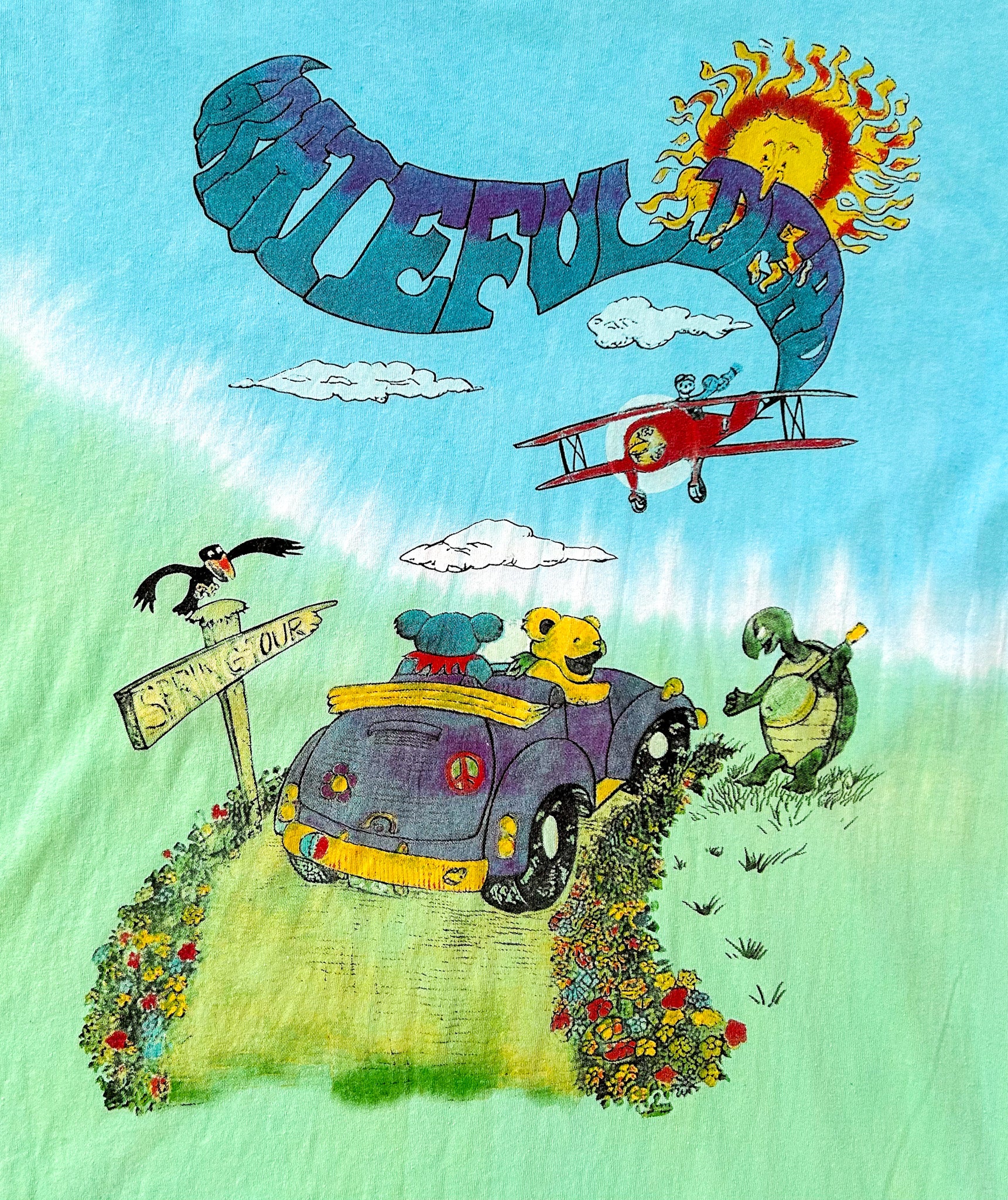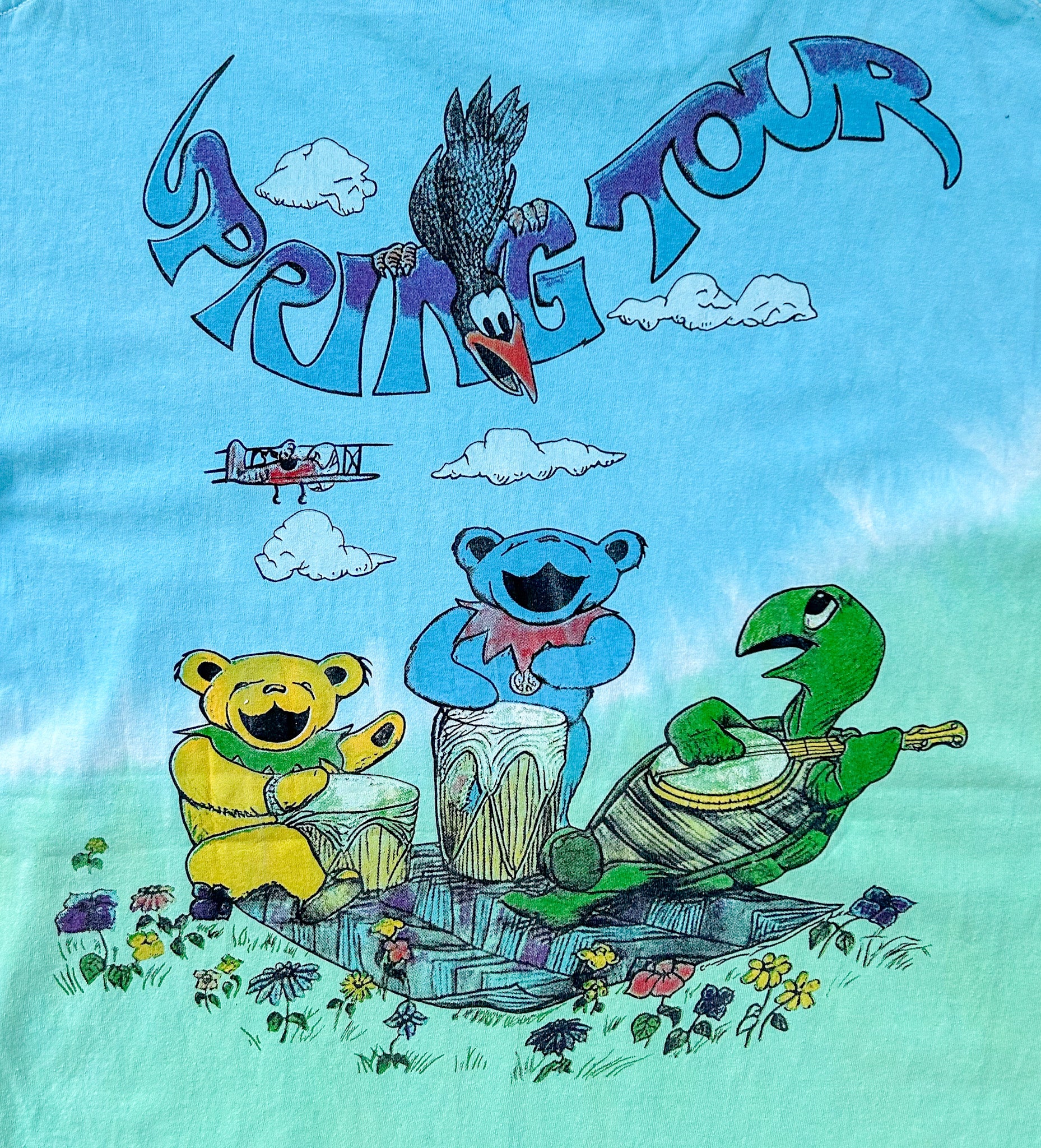 Iconic Spring Tour artwork with dancing bears, VW bug, airplane, sunshine, and musical turtle