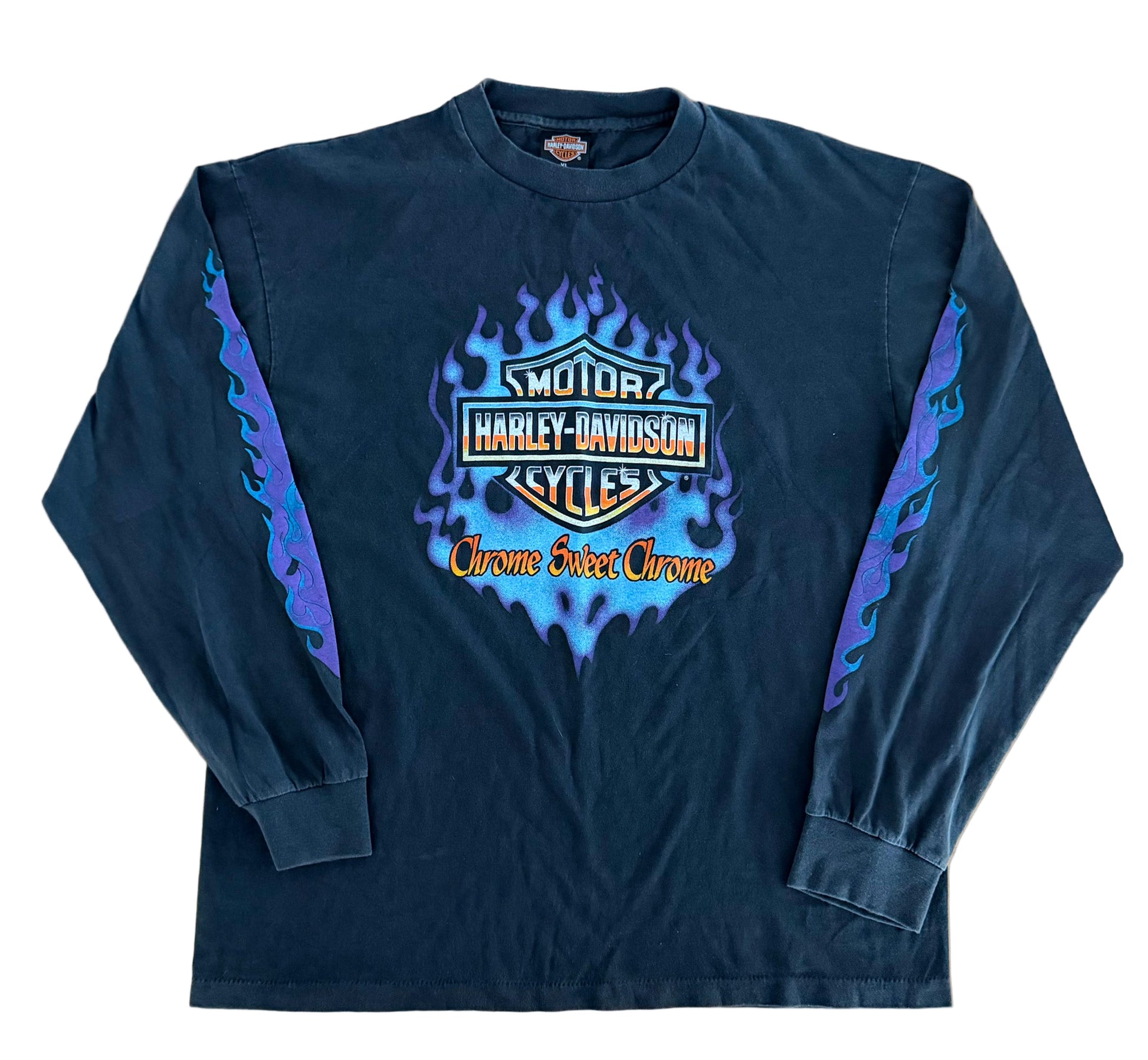 This authentic vintage 1992 Harley-Davidson long sleeve tee is a standout piece of 90s biker heritage and classic American streetwear. Featuring vibrant blue and purple flame graphics down both sleeves and the bold Chrome Sweet Chrome logo across the front, this shirt captures the raw attitude and energy of Harley’s golden era. The back print showcases the Daytona Beach, FL dealership graphic in electric blue – an iconic nod to one of the most legendary biker destinations in the world.