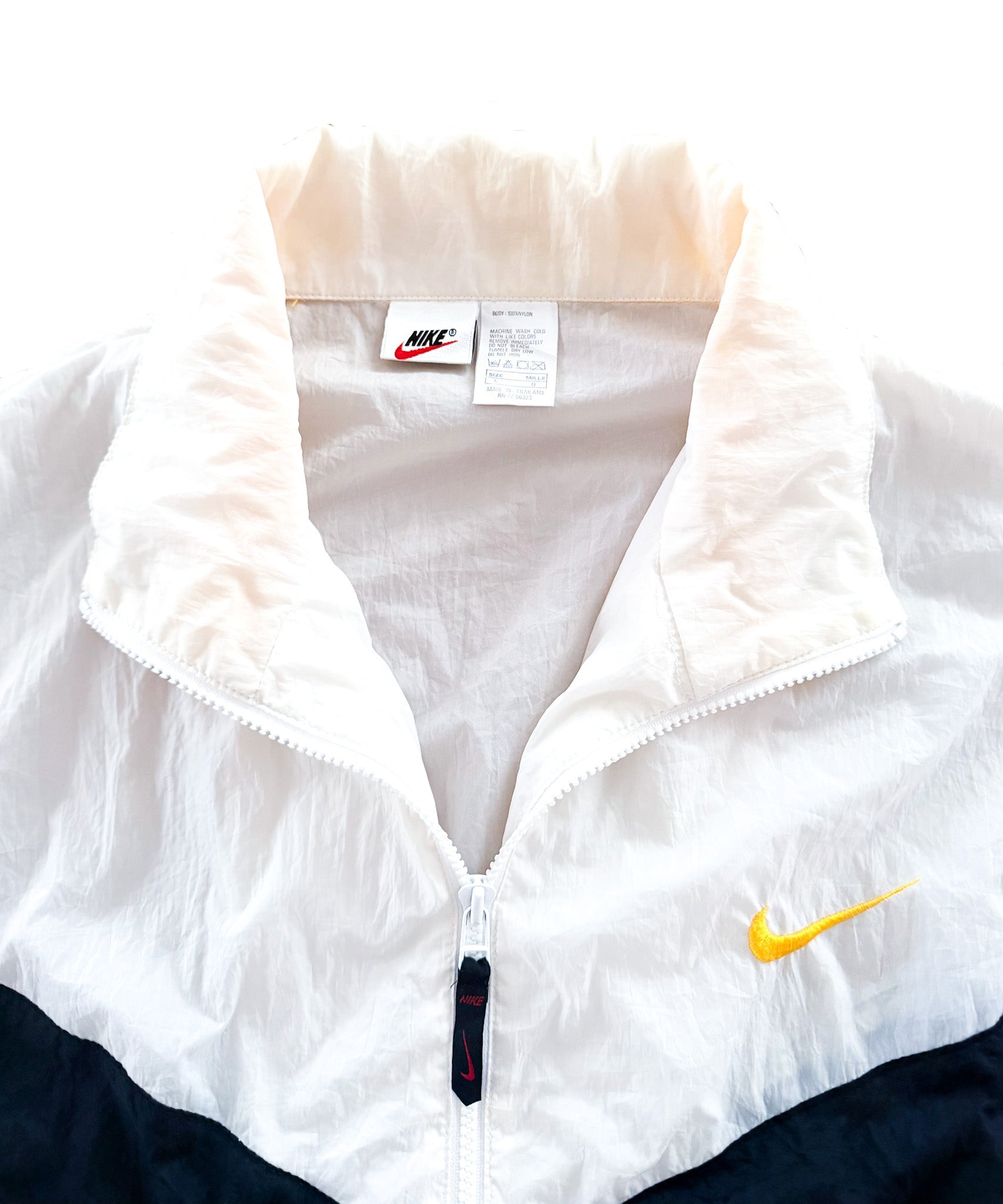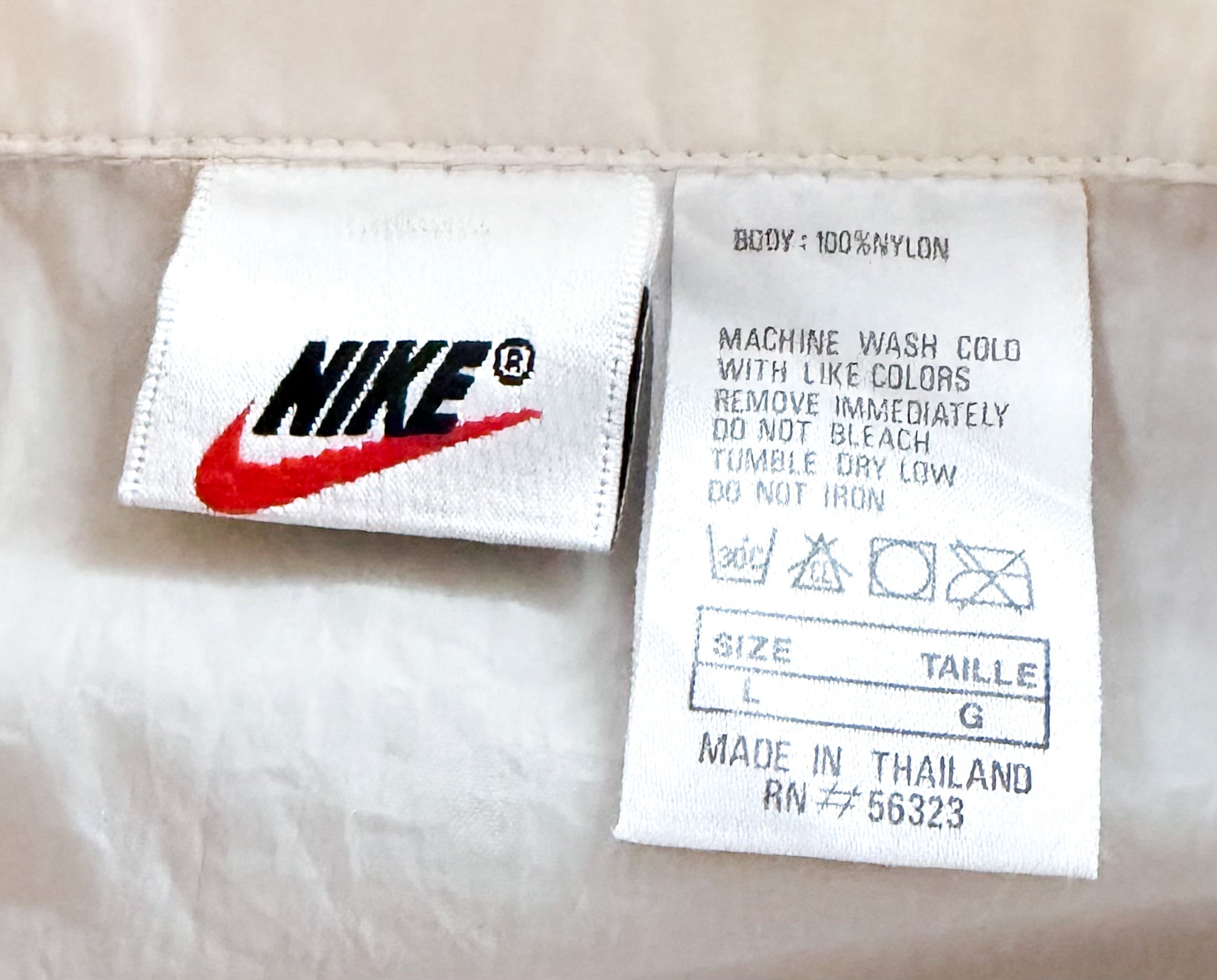 The piece carries an official Nike label and care tag indicating nylon construction and manufacture in Thailand, consistent with many Nike garments produced during the 1990s era of global sportswear manufacturing.