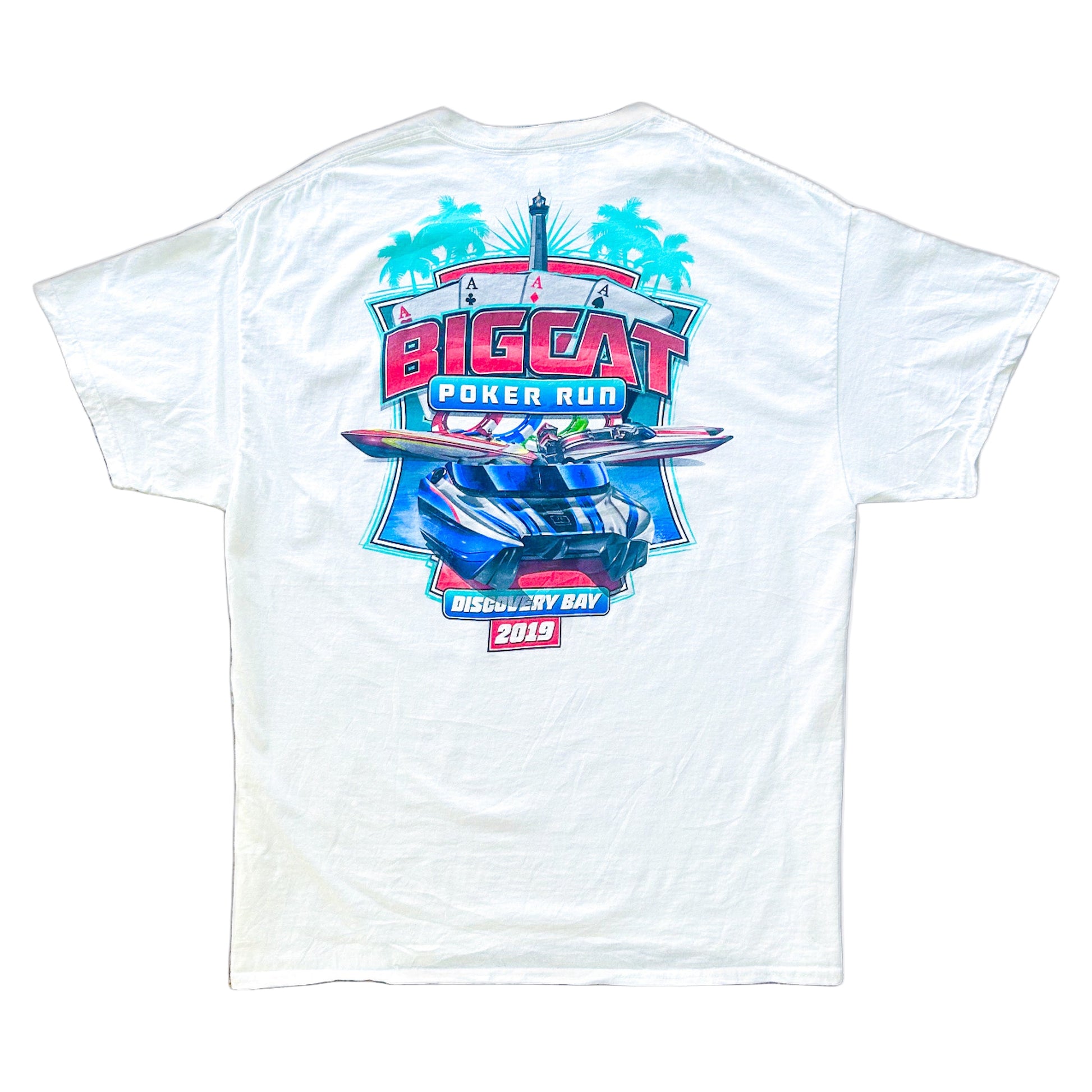 This authentic 2019 Big Cat Poker Run Discovery Bay T-shirt is a must-have for lovers of speedboat racing, poker run events, and collectible motorsport graphic tees. Featuring a bold full-colour back print with racing speedboats, poker cards, palm trees, and lighthouse graphics, this shirt captures the high-energy vibe of the famous Discovery Bay Big Cat Poker Run.