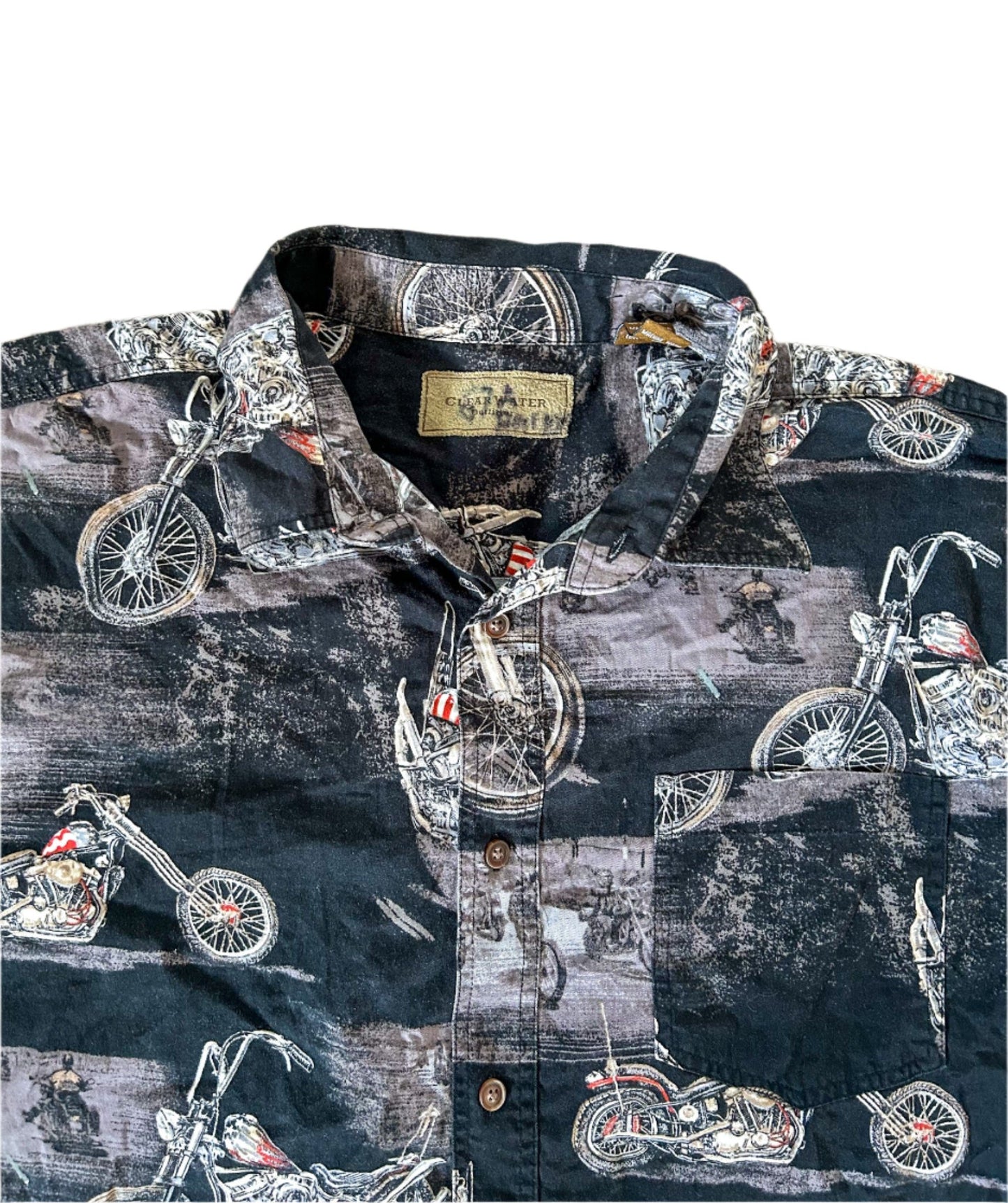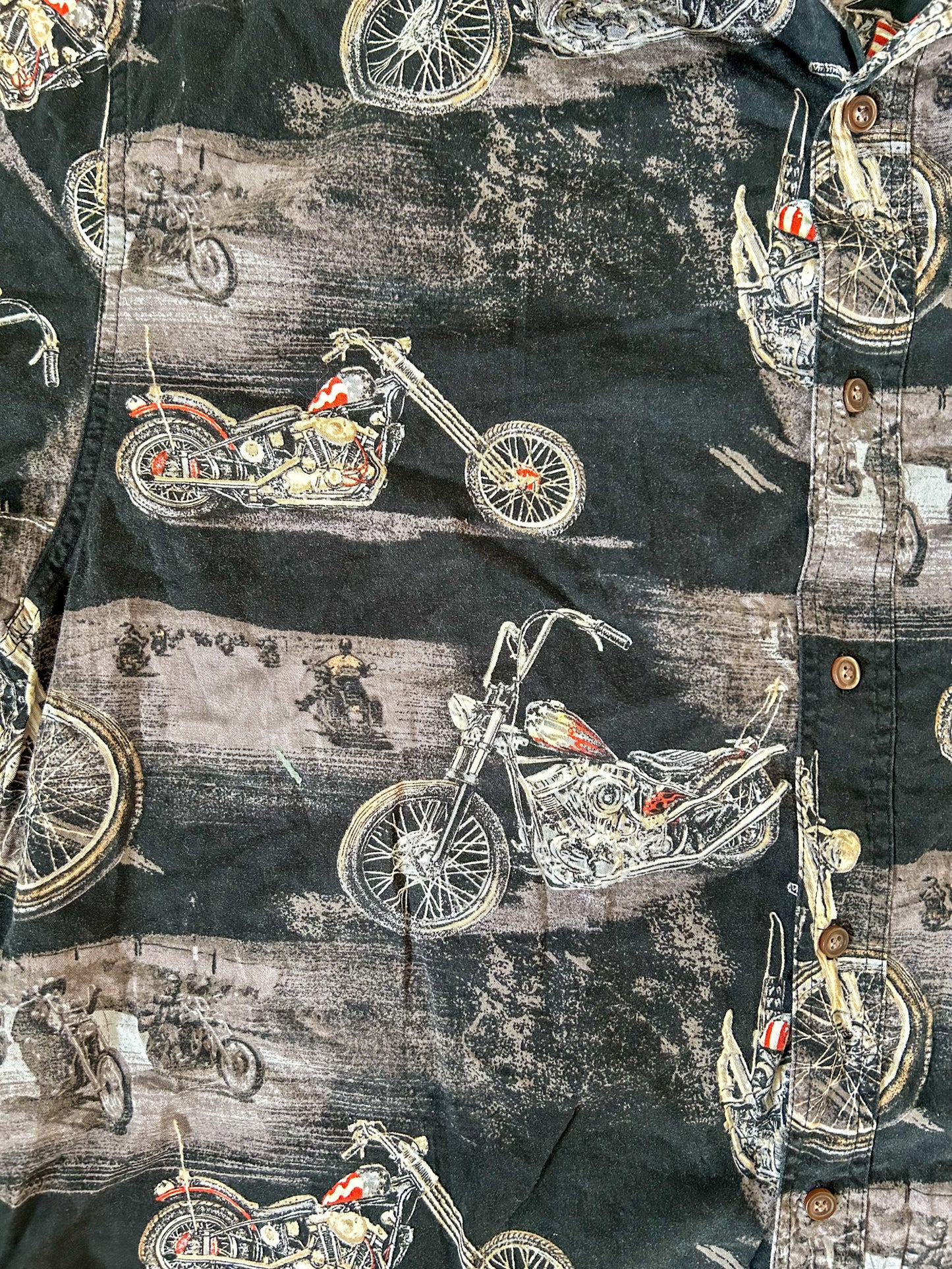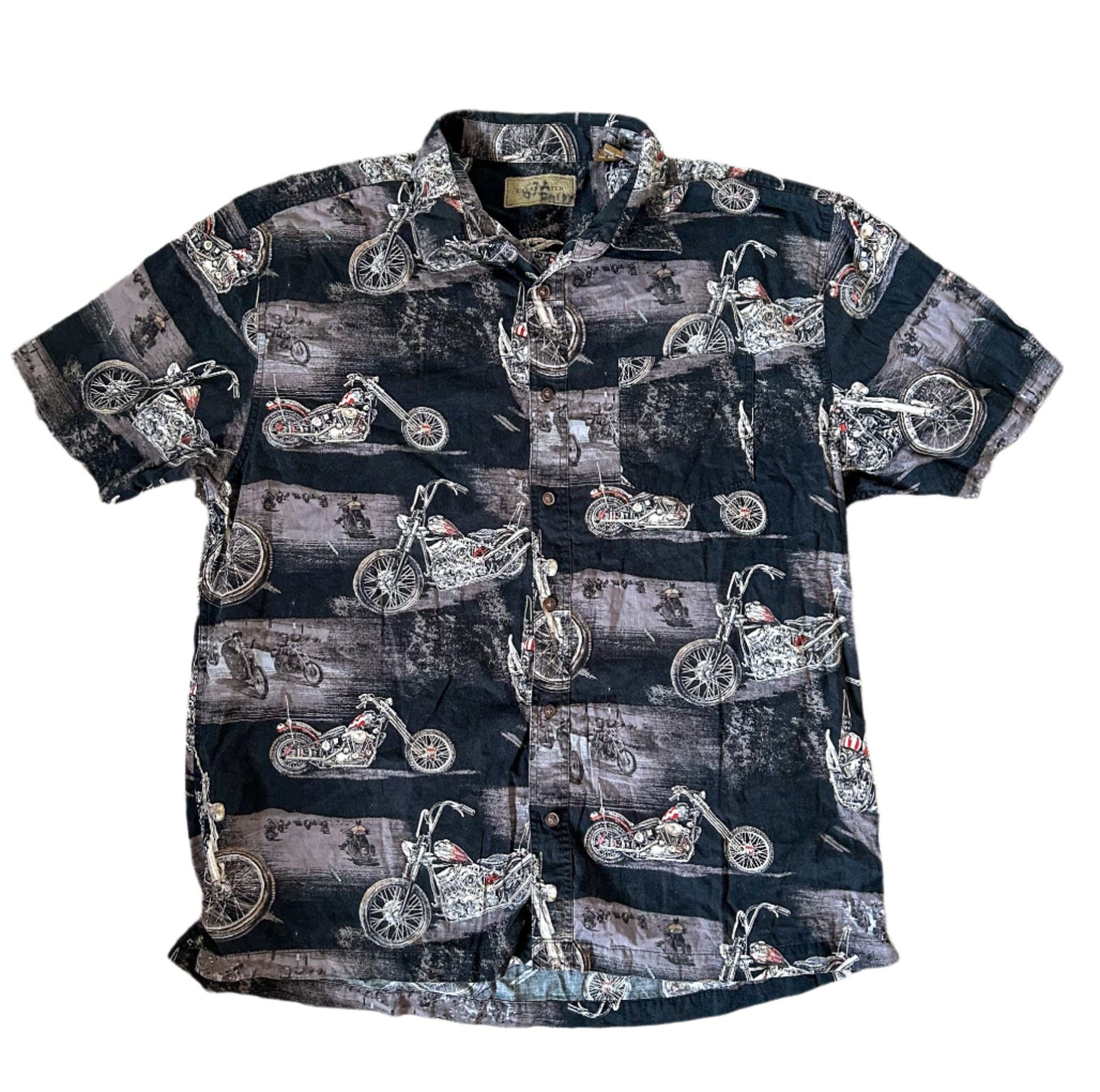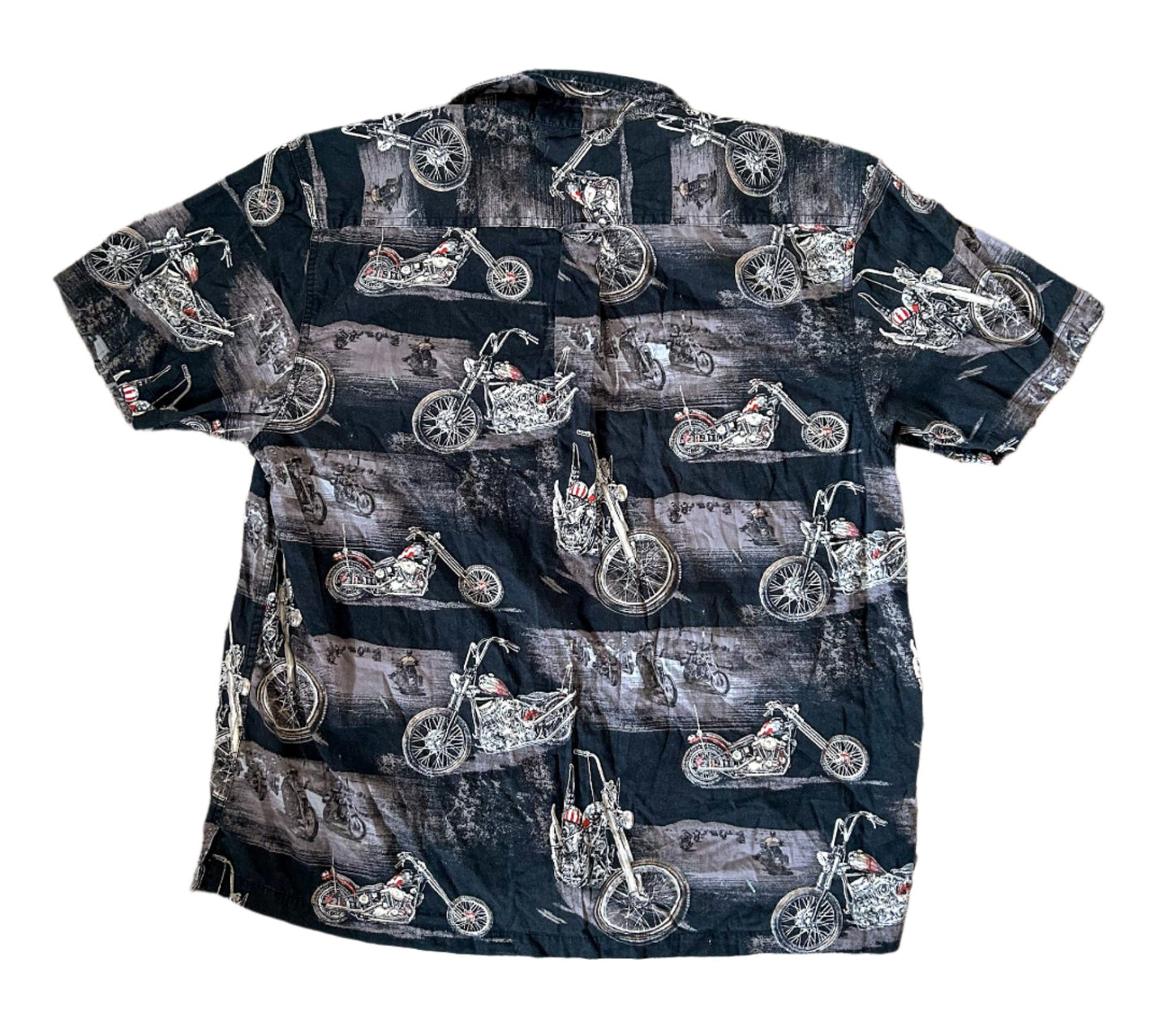 Vintage Black Motorcycle Print Cotton Short Sleeve Shirt XL