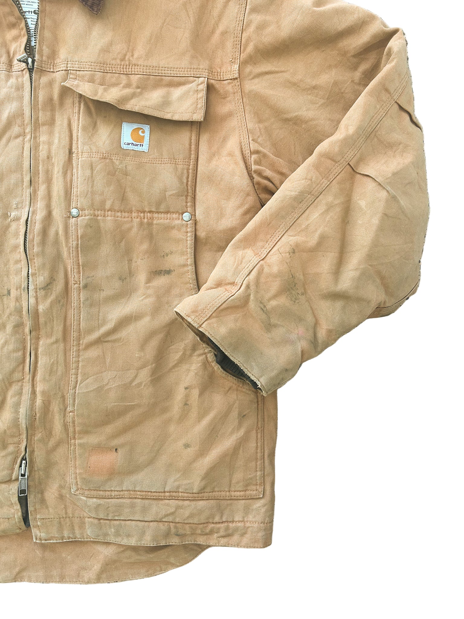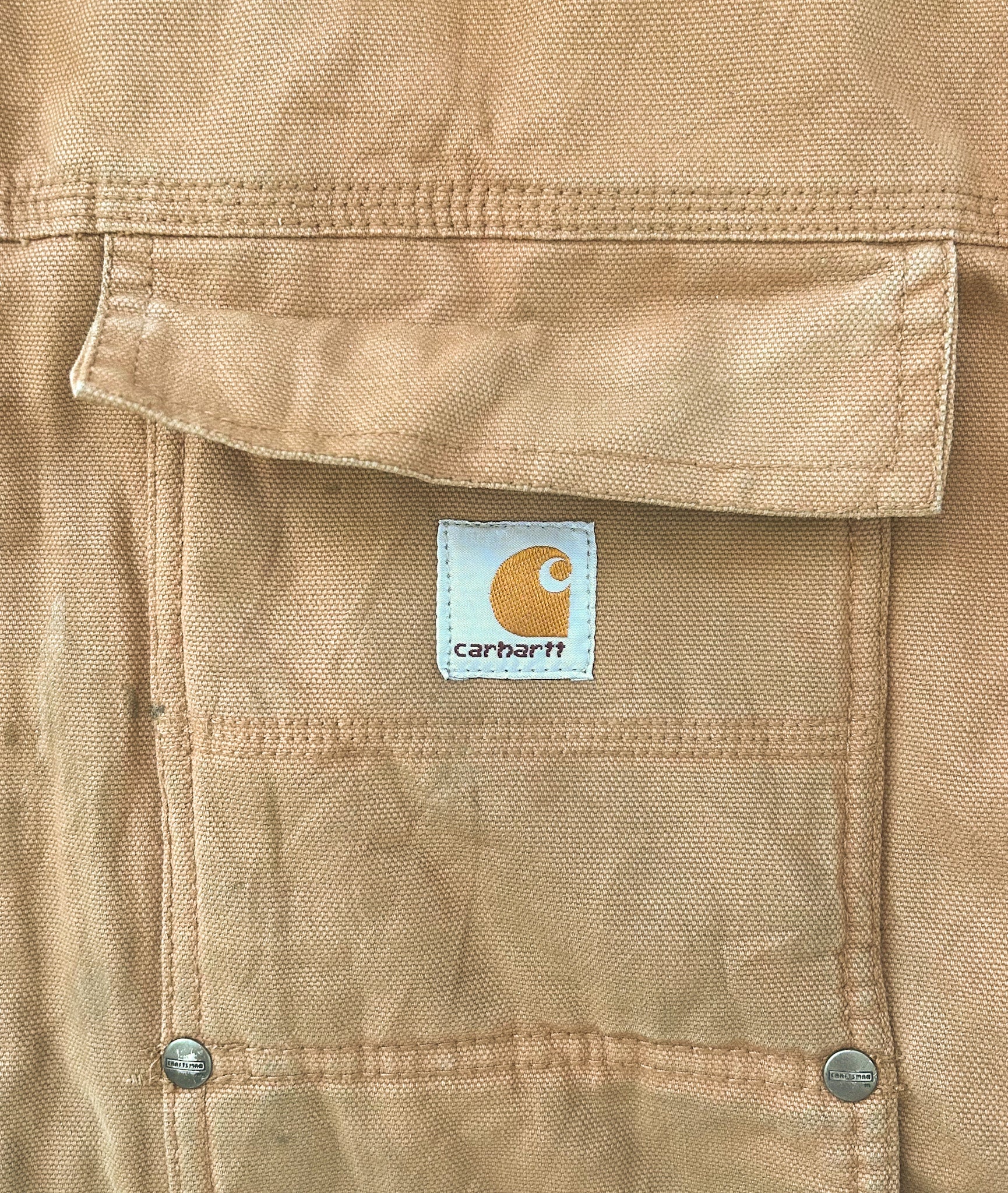 Condition: True vintage condition – authentic workwear wear with visible marks, light fading, and small repaired tears consistent with age and use (see photos). Adds unique patina and character – exactly what makes vintage Carhartt special.This jacket has had a replacement zip fitted and new studs added, ensuring it remains fully functional and wearable while retaining its original rugged character.