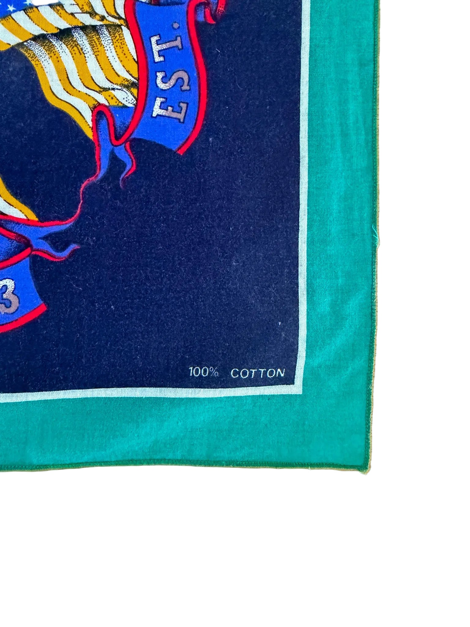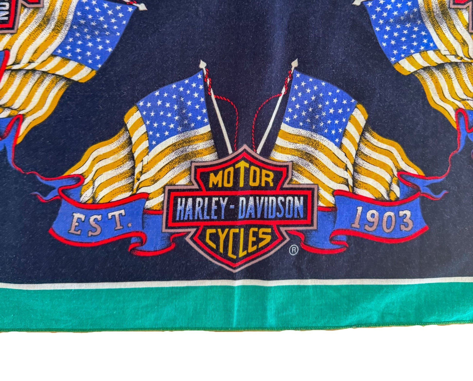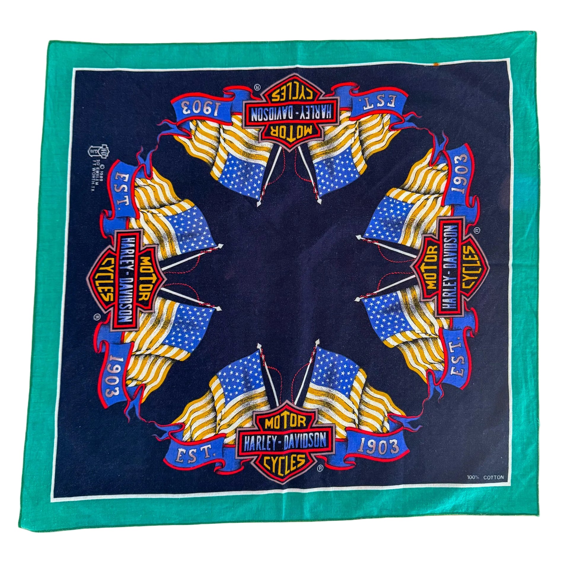 This is a killer vintage Harley-Davidson bandana featuring a bold Americana design. The iconic Bar & Shield logos are framed by waving U.S. flags and “Est. 1903” banners, all set against a deep navy centre with a green border — such a standout colour combo.