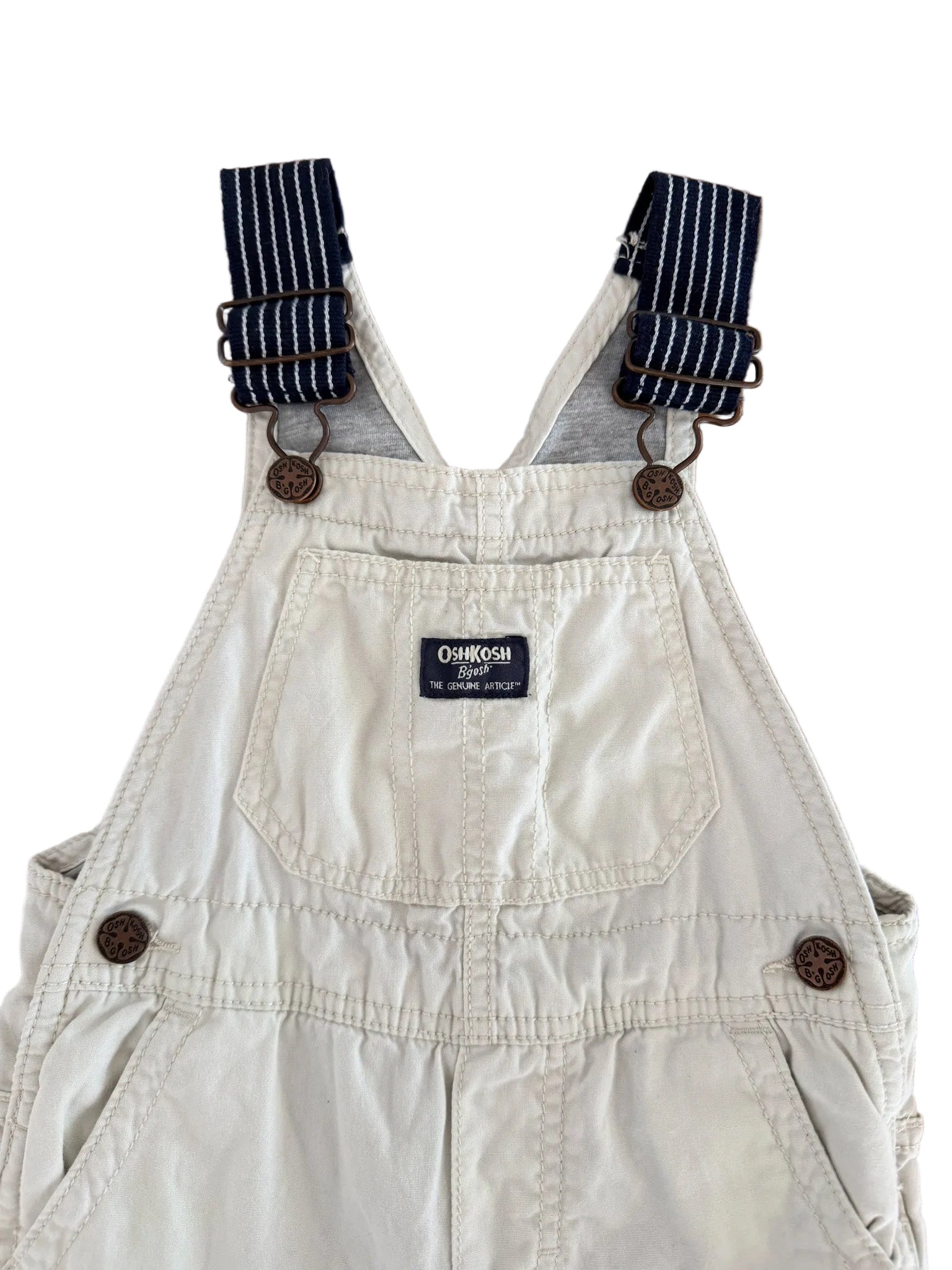 These classic OshKosh B’gosh overalls bring timeless American workwear style to a kids wardrobe in a soft cream / off-white tone. A standout alternative to traditional denim, this pair has that vintage utility look with a lighter, versatile feel.