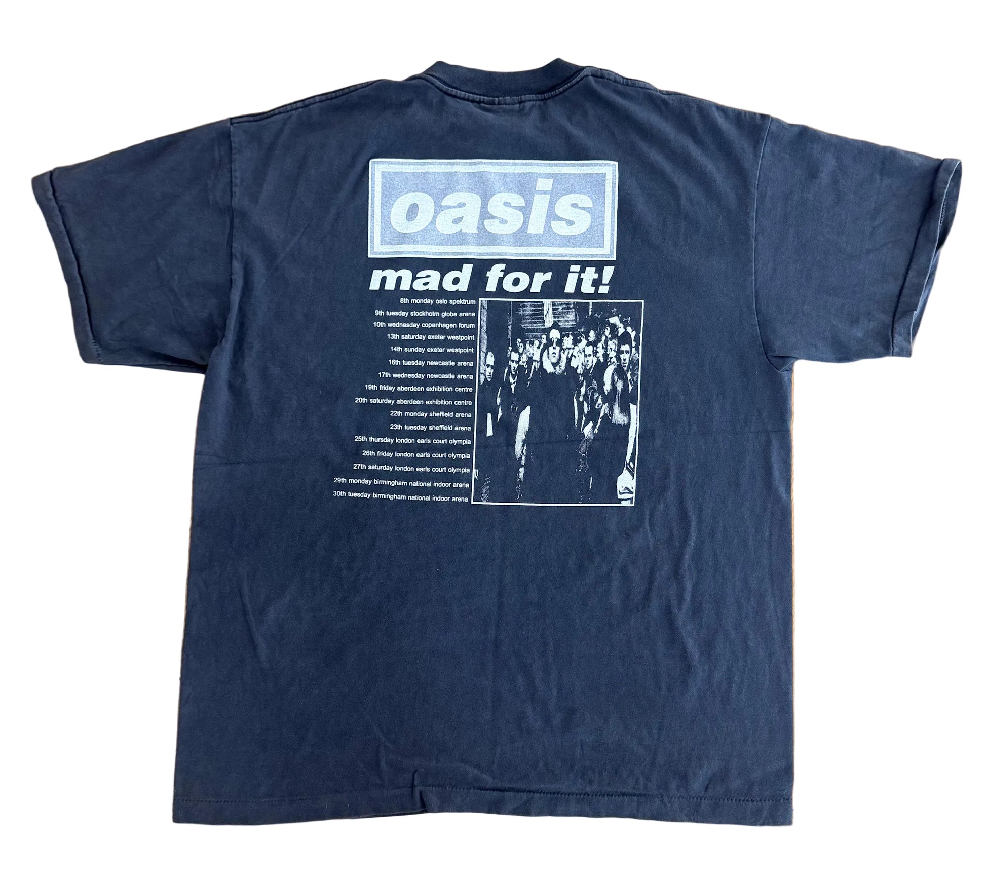 A standout tour tee of Oasis’s legendary Be Here Now era. This piece features the iconic Rolls-Royce swimming pool artwork on the front, with the “mad for it!” slogan and full UK tour dates printed on the back — a true snapshot of Oasis at their peak.