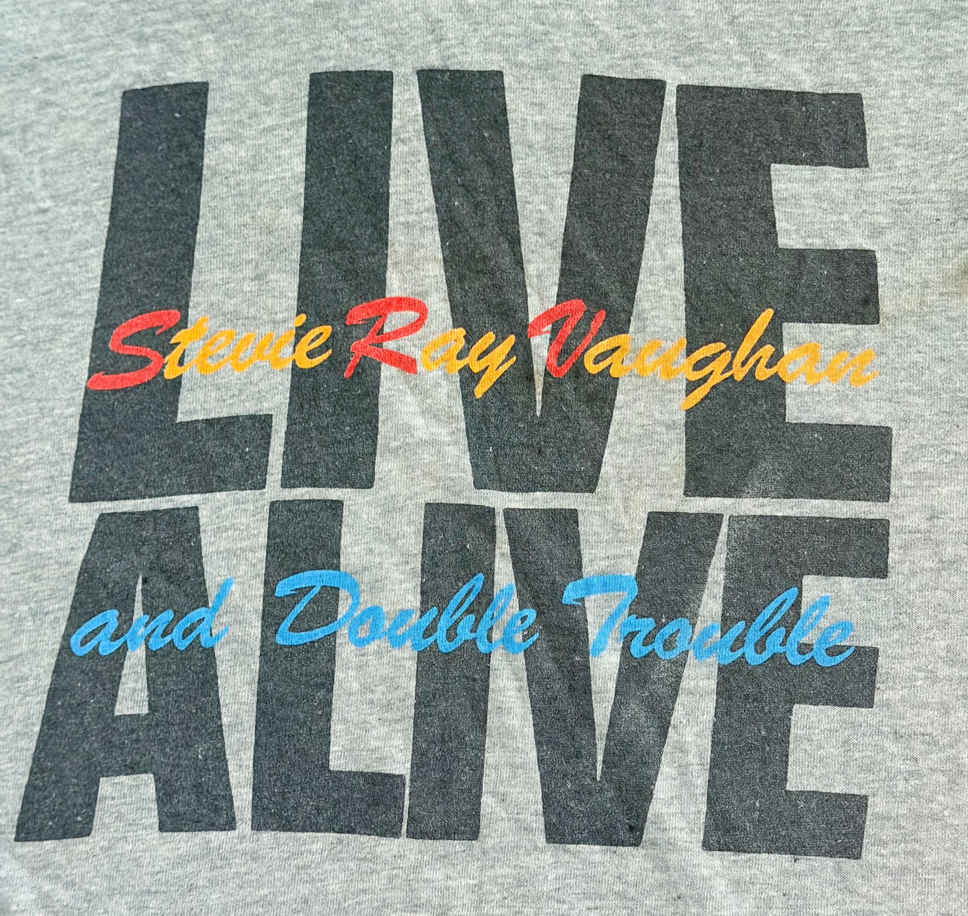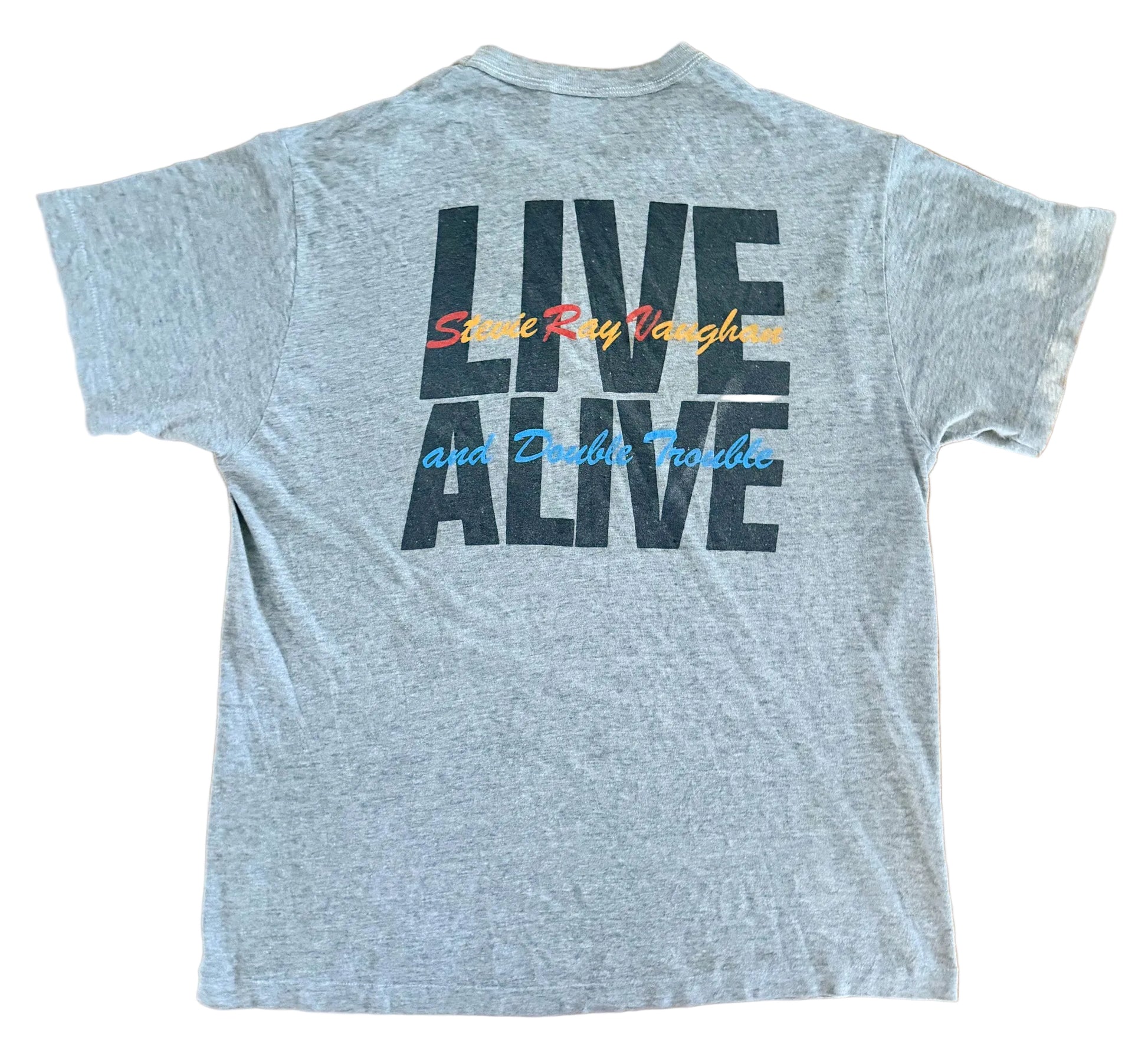 A fantastic vintage Stevie Ray Vaughan and Double Trouble band t-shirt, featuring a classic guitar graphic across the chest and a bold “LIVE ALIVE” back print.
