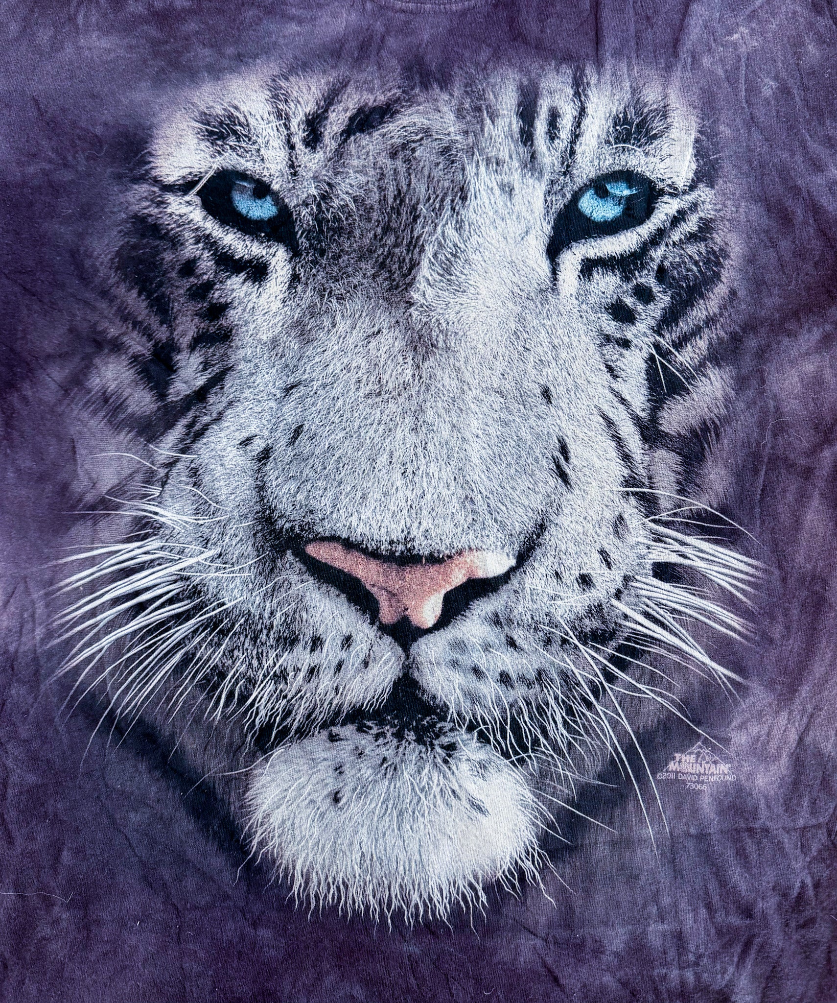 This vintage The Mountain White Tiger T-shirt is an iconic piece of 90s–2000s wildlife graphic art. Featuring a striking hyper-realistic white tiger face print with piercing blue eyes, this tee captures the bold, maximalist energy that defined The Mountain’s legendary animal print era.