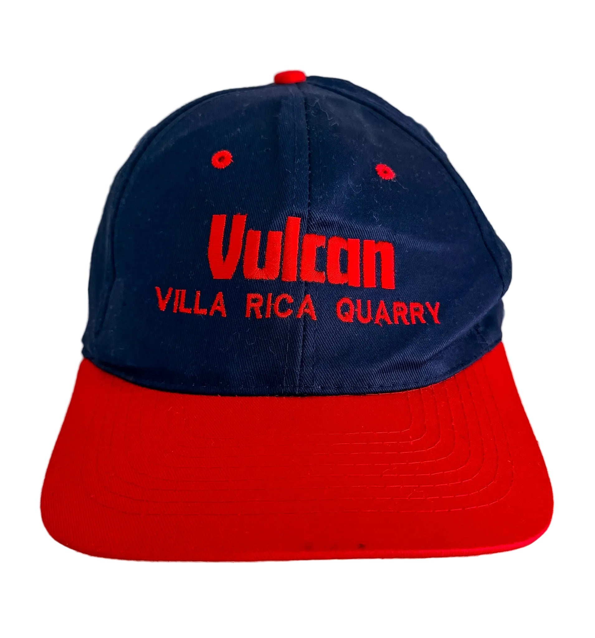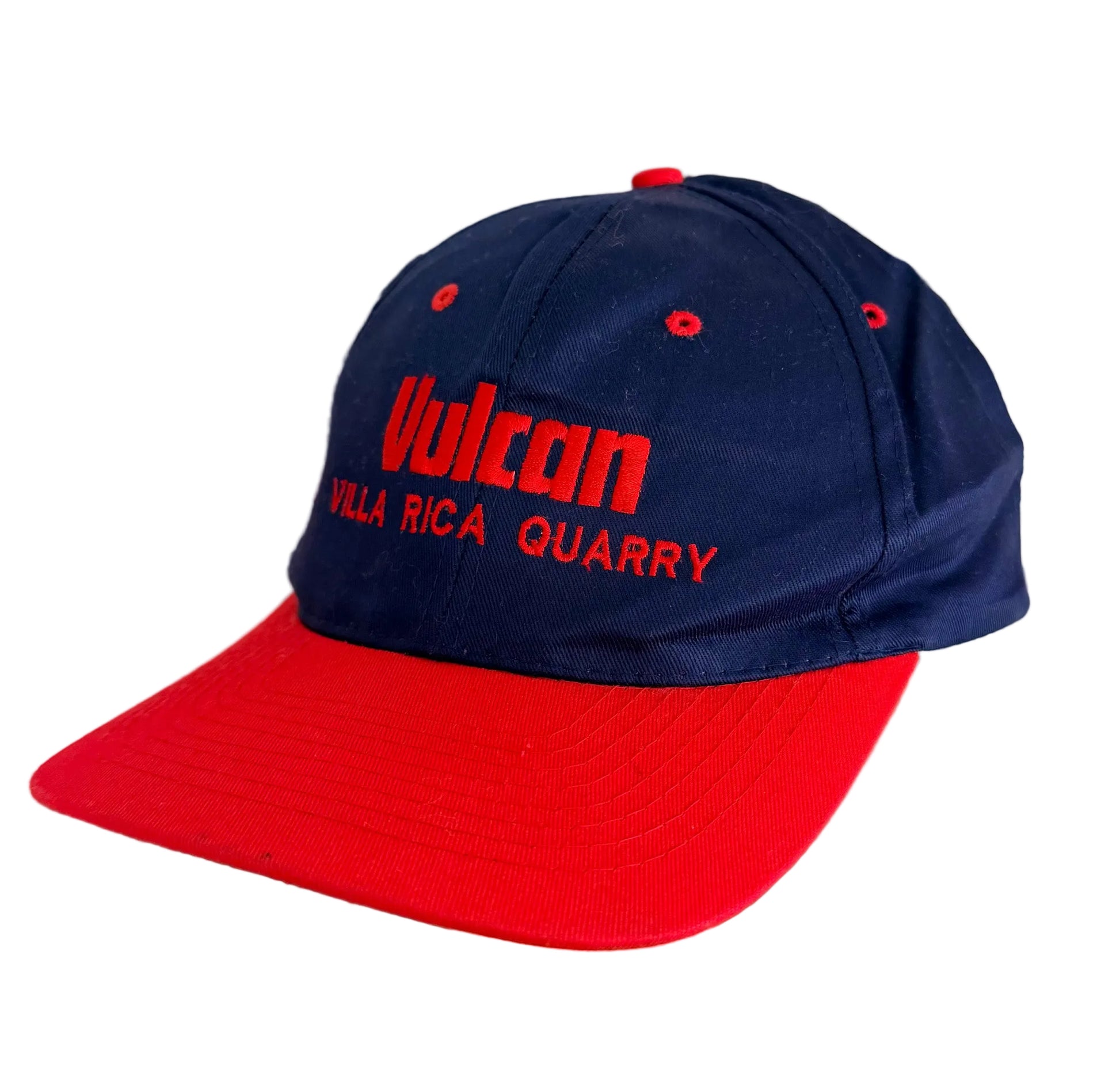 Vintage Vulcan Villa Rica Quarry promotional snapback cap featuring bold embroidered front branding in a striking red and navy colour combination.