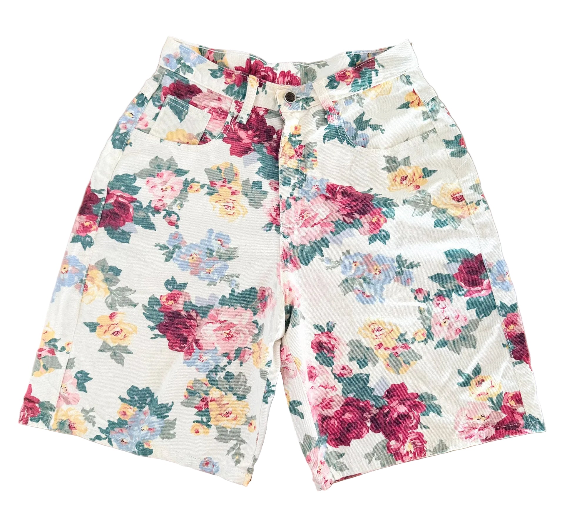These authentic vintage Zena floral denim shorts are a standout 90s / early Y2K statement piece, featuring an all-over romantic rose floral print on a crisp white denim base. With shades of pink, red, yellow, blue, and green florals throughout, these shorts deliver classic 90s feminine streetwear with a timeless summer aesthetic.